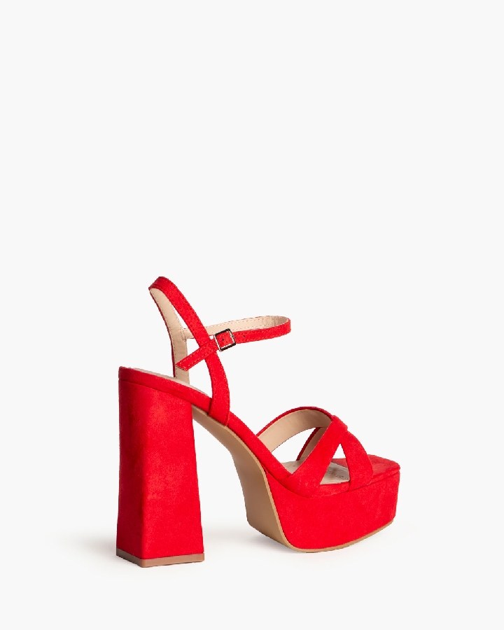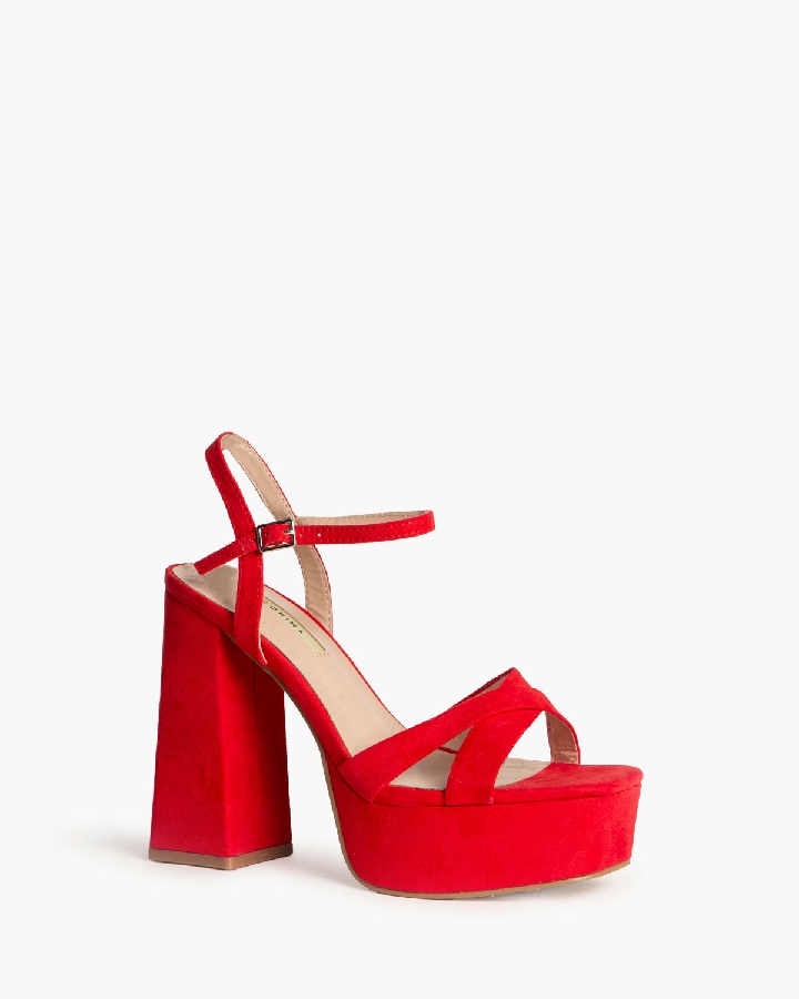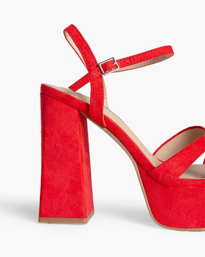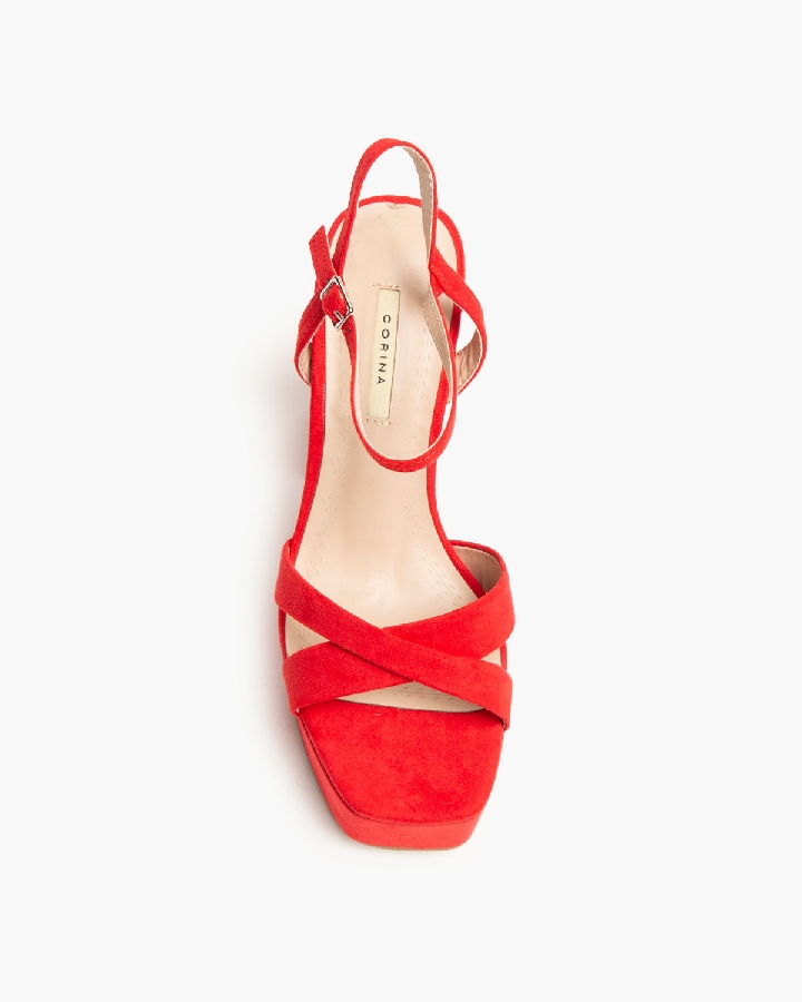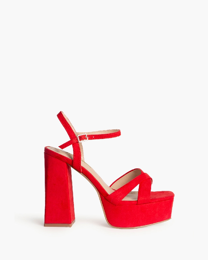 Sandalia de tacón alto con plataforma. Tiras cruzadas en parte delantera. Acabada en punta cuadrada. Cierre mediante pulsera en el tobillo con hebilla en la parte exterior.