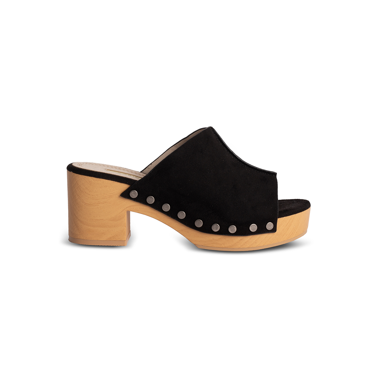Sandalia destalonada tipo zueco. Corte tipo pala ancha en antelina y tachas en los laterales. Planta en ante.