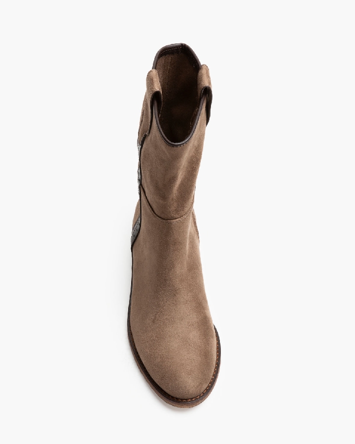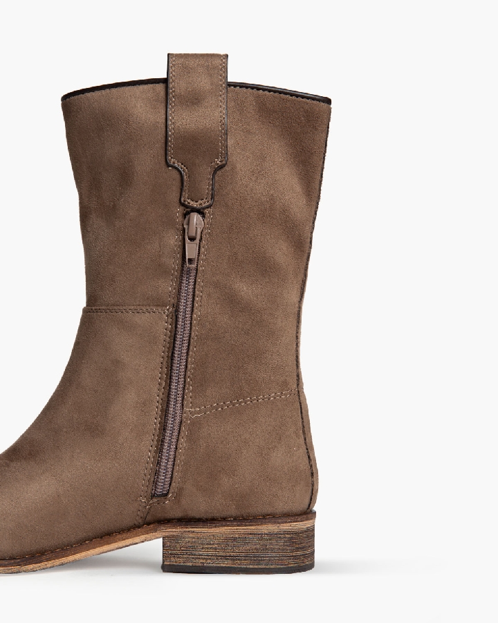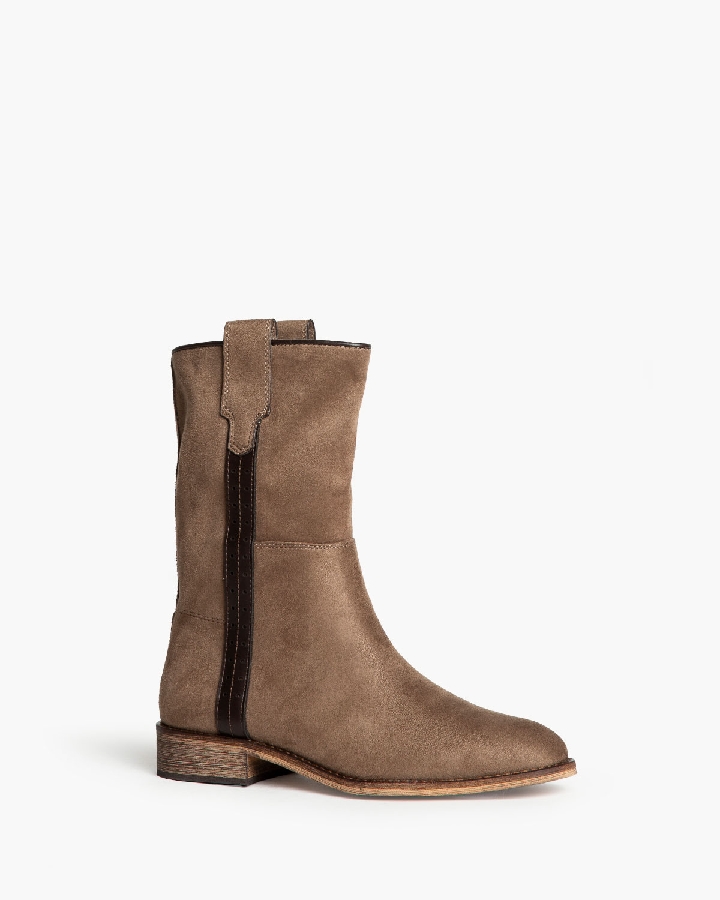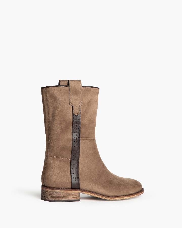 Botín plano tipo cartujano con caña ancha. Tirador en los laterales. Acabado en punta redondeada. Detalle troquelado en las tiras laterales. Cremallera en el lateral interior.