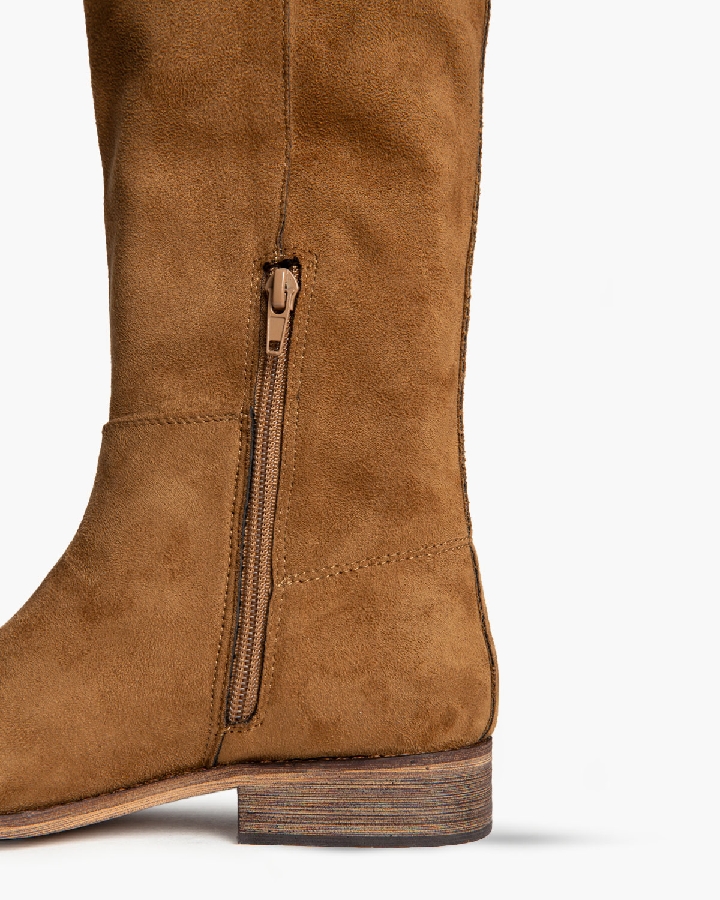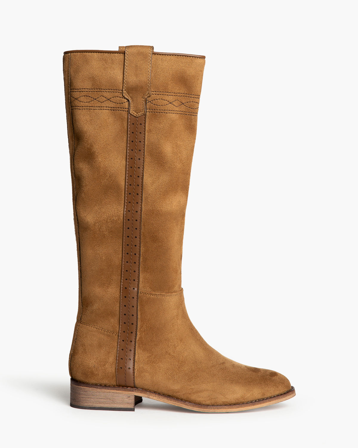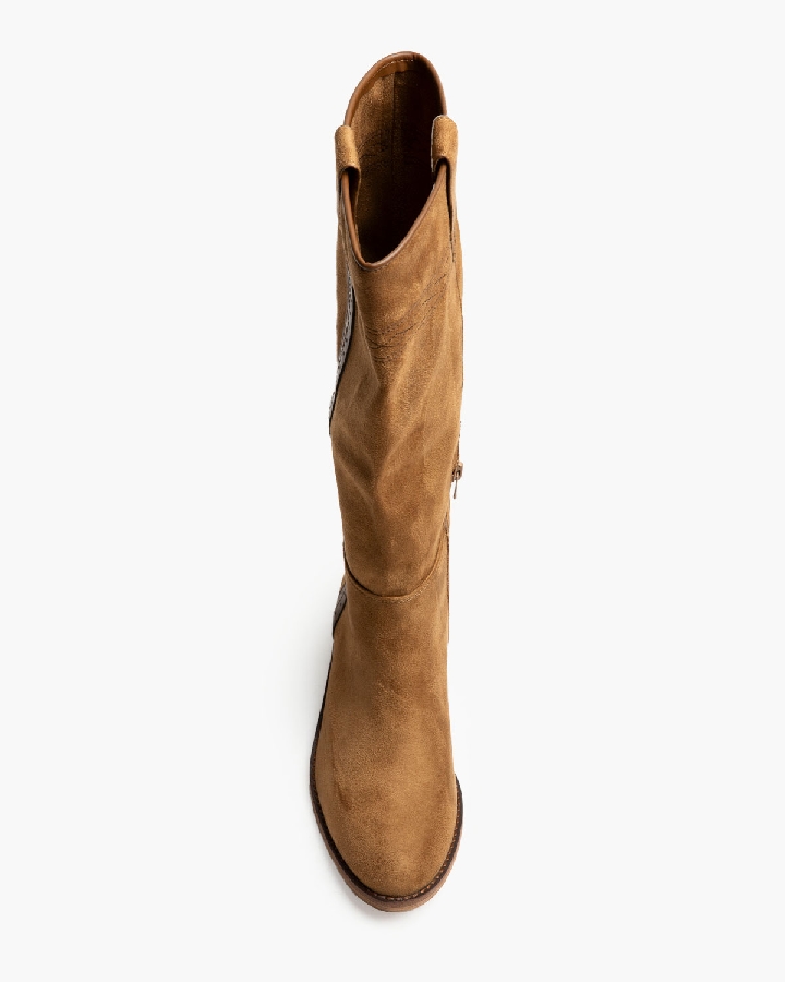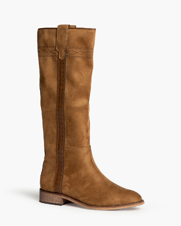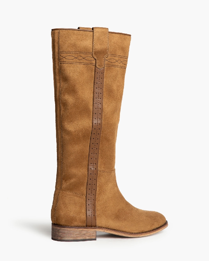 Bota plano tipo cartujano con caña ancha. Tirador en los laterales. Acabado en punta redondeada. Detalle troquelado en las tiras laterales. Cremallera en el lateral interior.