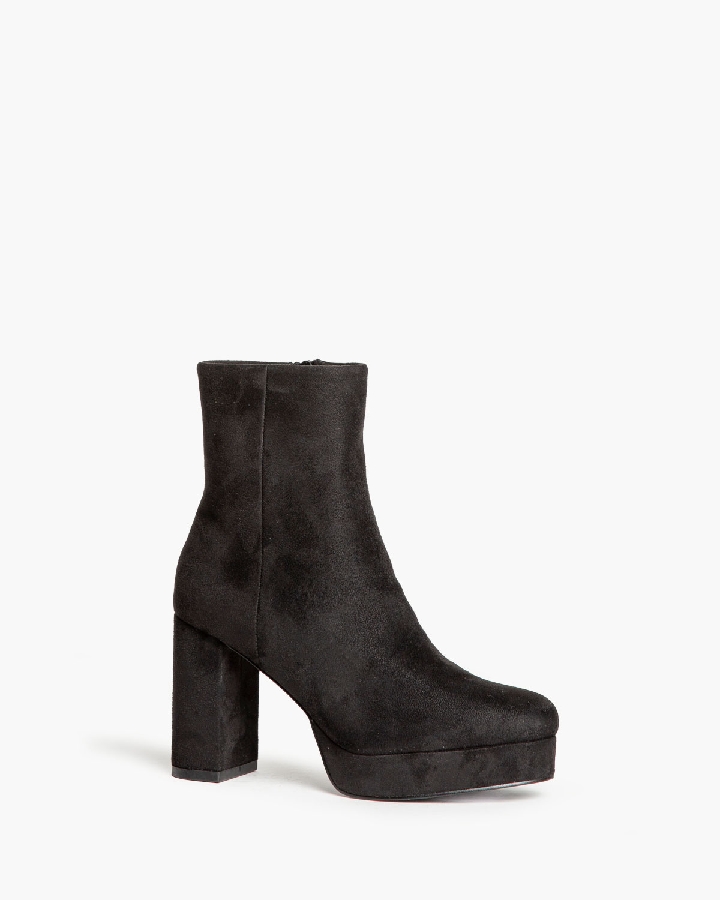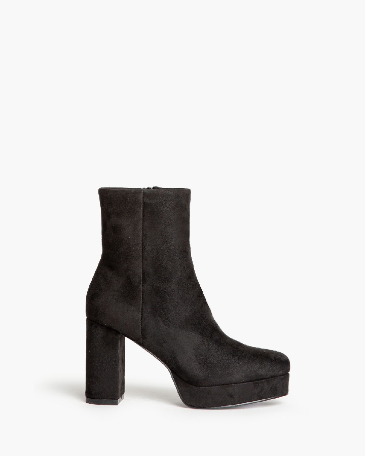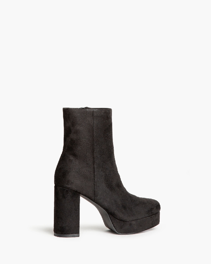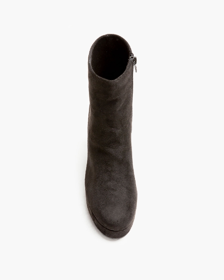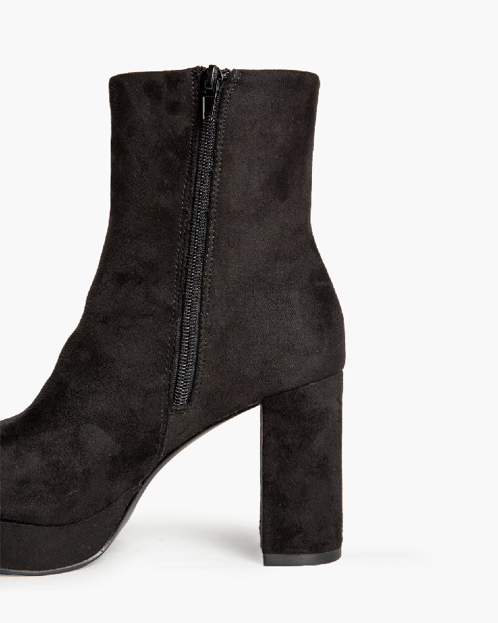 Botín con corte en material tipo antelina. Caña ajustada. Tacón ancho con plataforma. Acabado en punta redonda. Cremallera en la parte lateral interior.