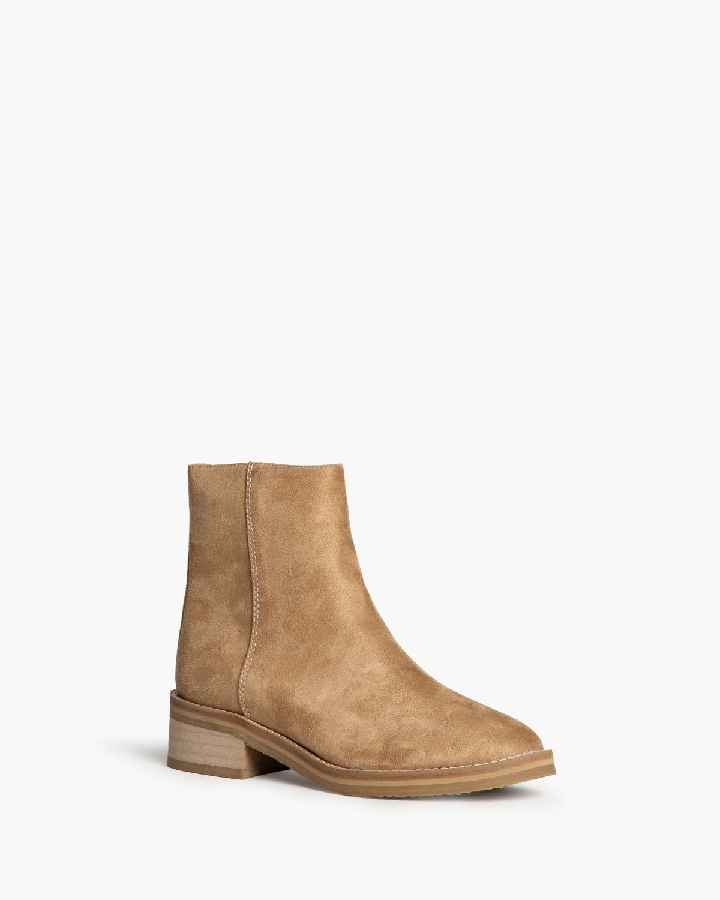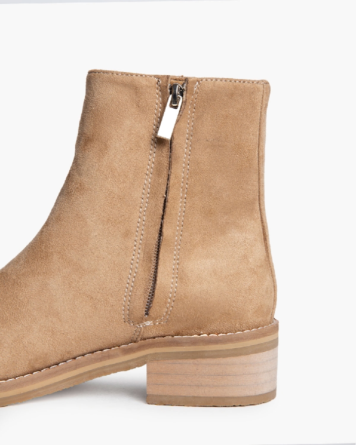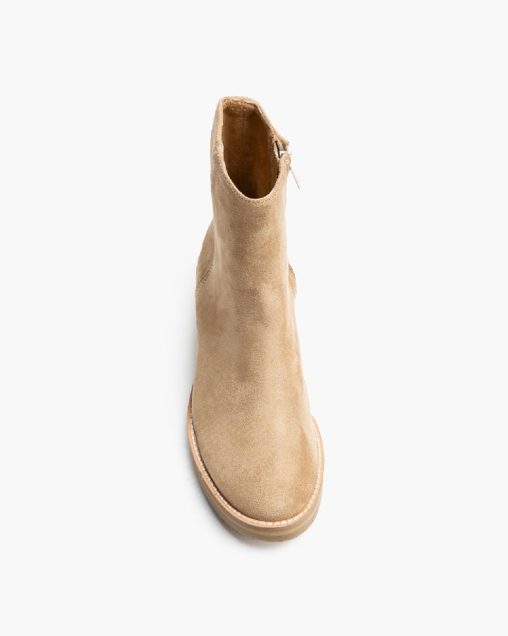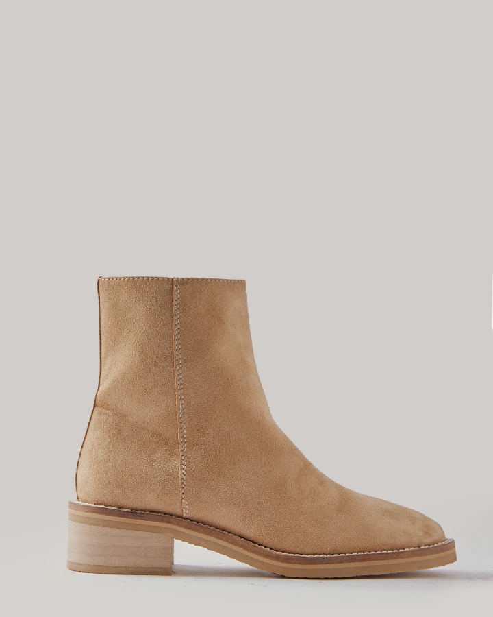 Botín plano con piso con efecto crepé. Corte en antelina. Detalle de cosido en la vira. Cremallera en el lateral interior.