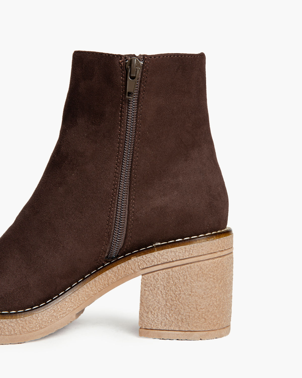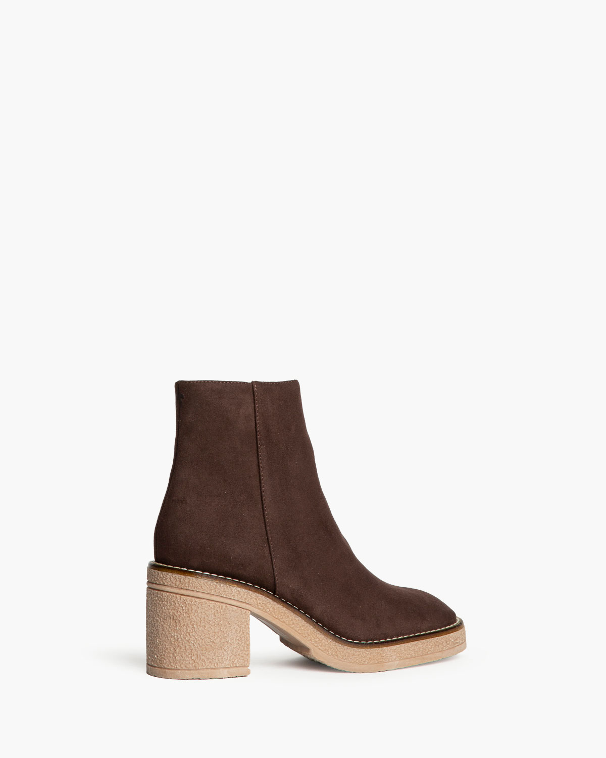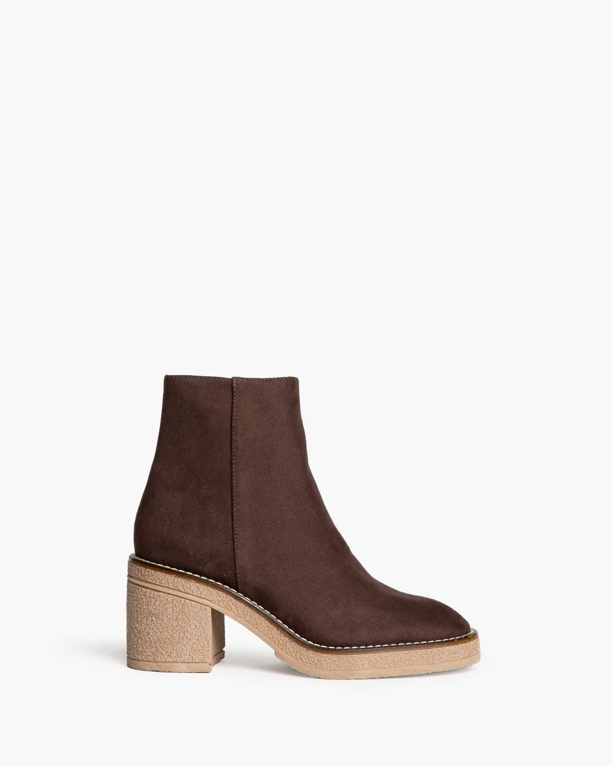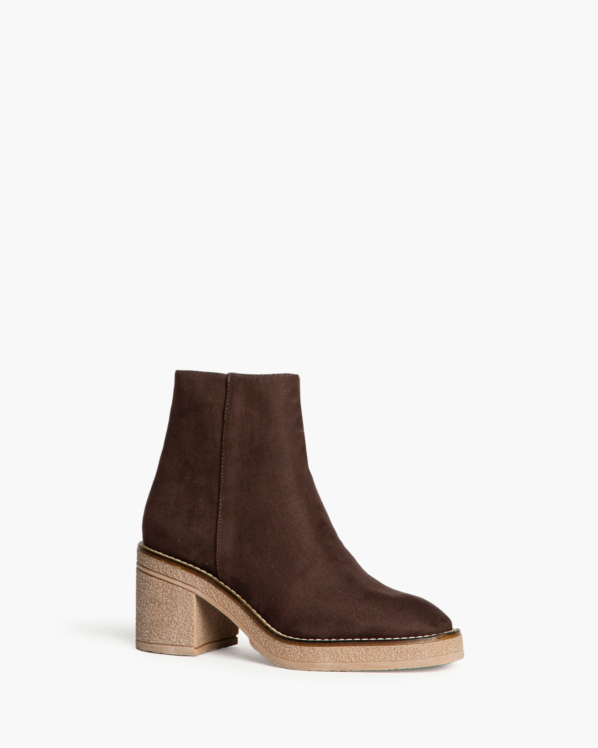 Botín de tacón ancho con piso con efecto crepé. Corte en antelina. Detalle de cosido en la vira. Cremallera en el lateral interior.