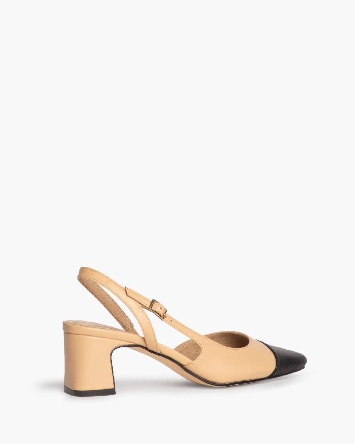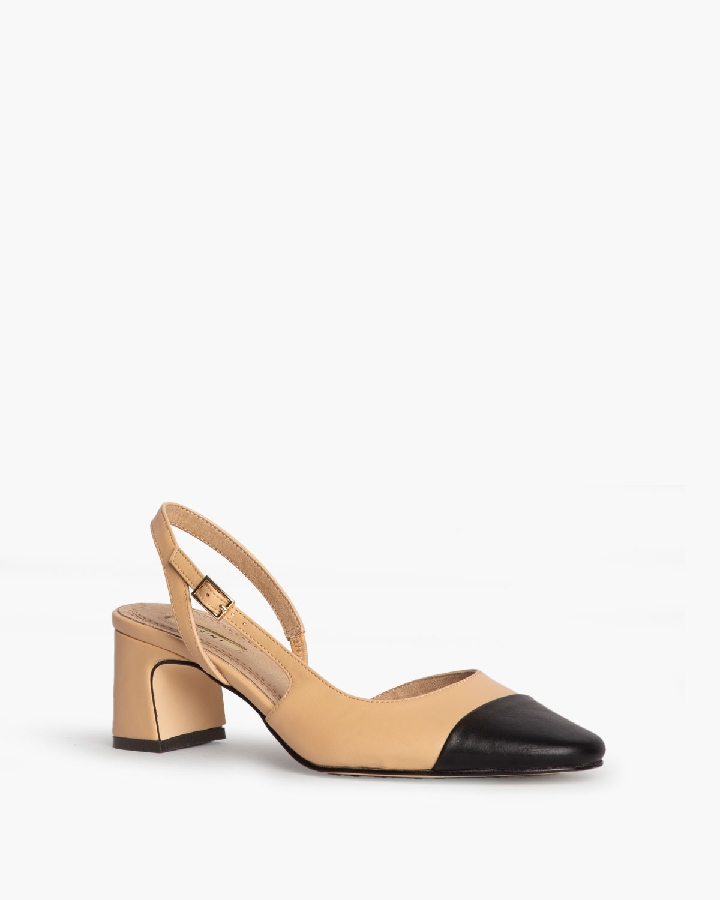 Salón de tacón bajo destalonado con corte efecto piel. Detalle en la puntera. Cierre mediante hebilla en la parte lateral exterior.