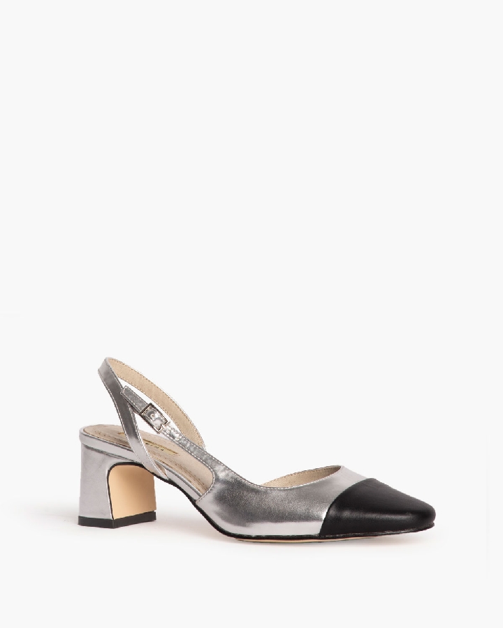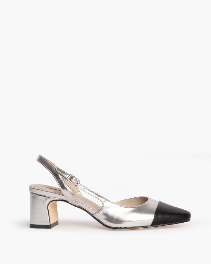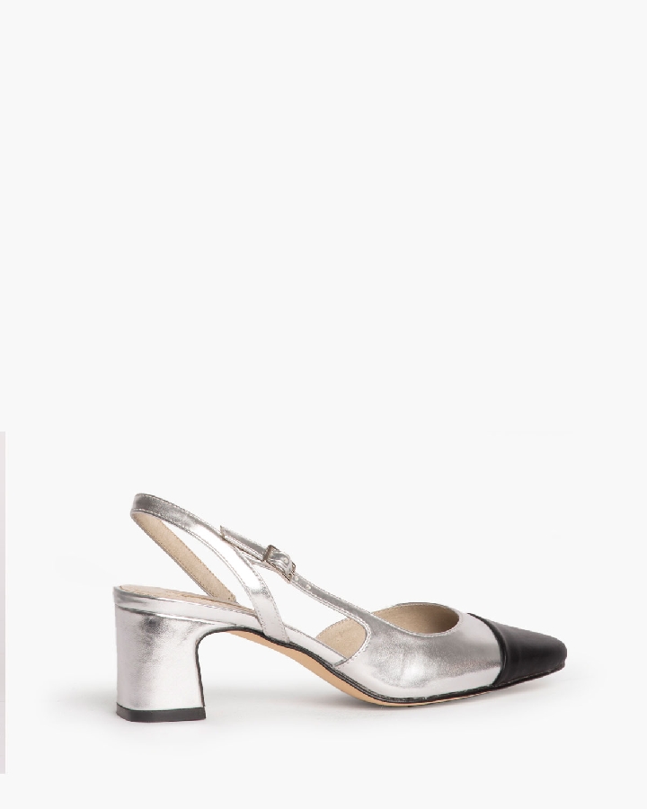 Salón de tacón bajo destalonado con corte efecto piel. Detalle en la puntera. Cierre mediante hebilla en la parte lateral exterior.
