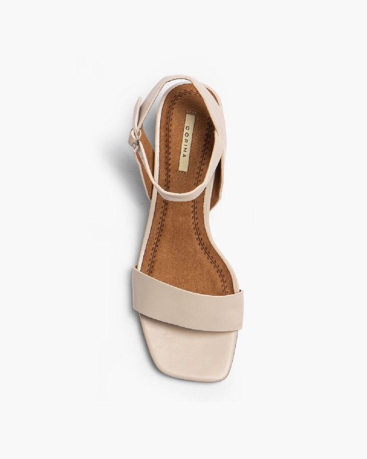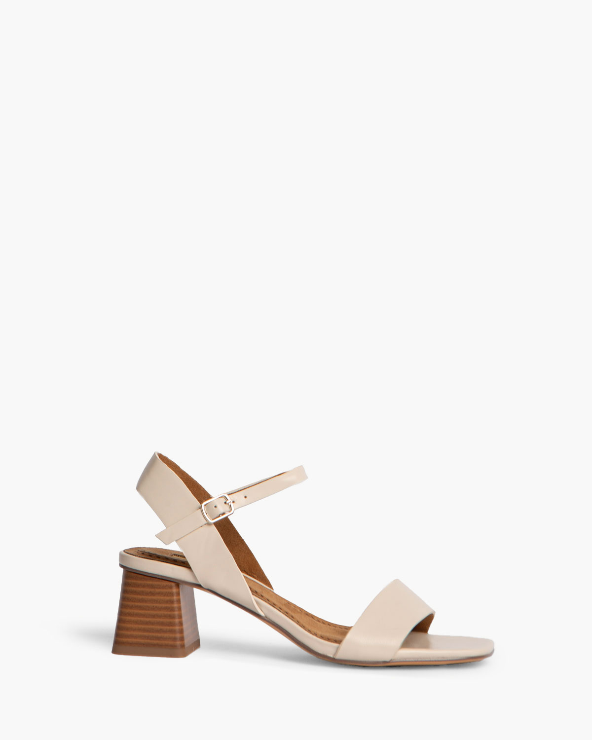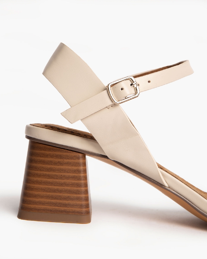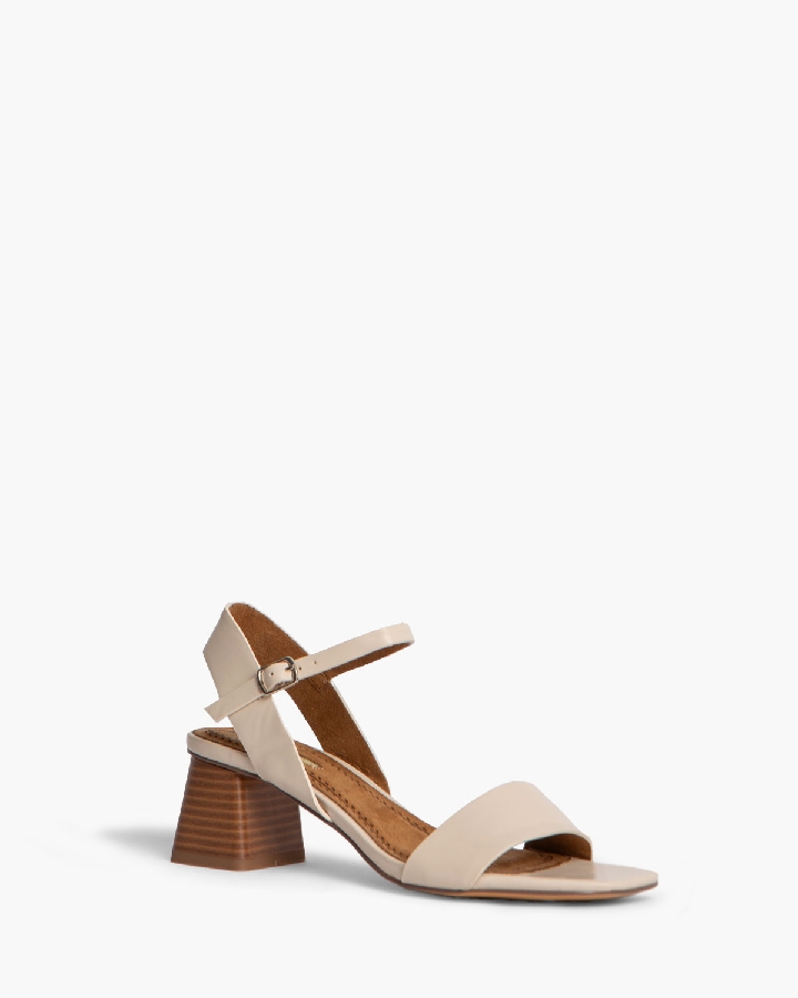 Sandalia de tacón bajo. Corte efecto piel. Cierre mediante pulsera al tobillo con hebilla en el lateral exterior. Tacón ancho y acabado en punta cuadrada.