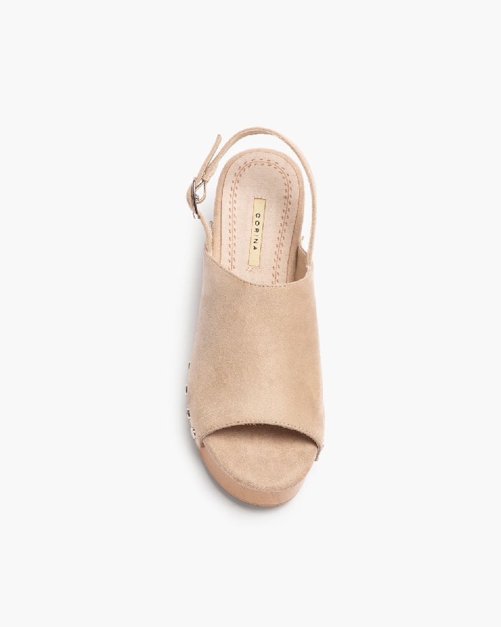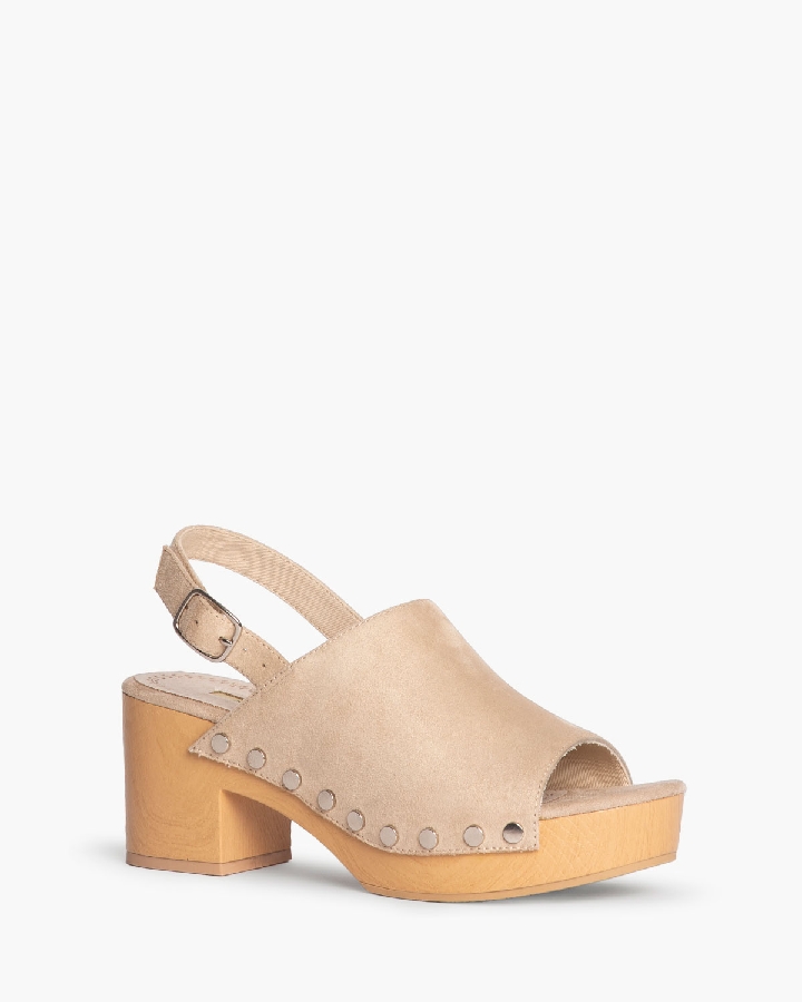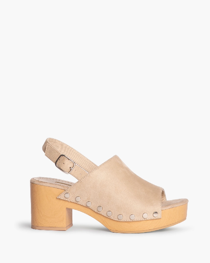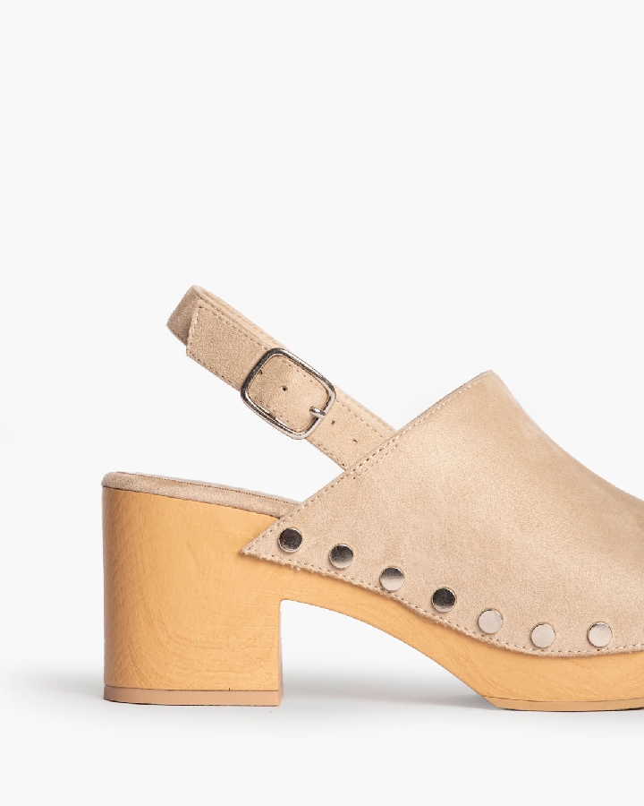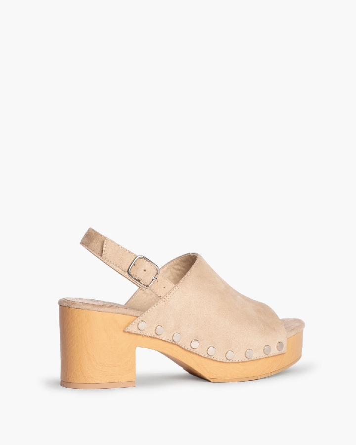 Sandalia tipo zueco con piso efecto madera. Corte tipo antelina. Detalle de tachas entre el corte y el piso. Tira en el talón con hebilla en la parte exterior.