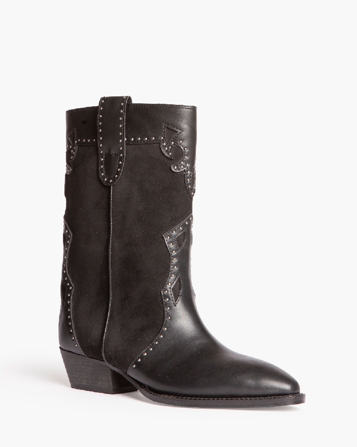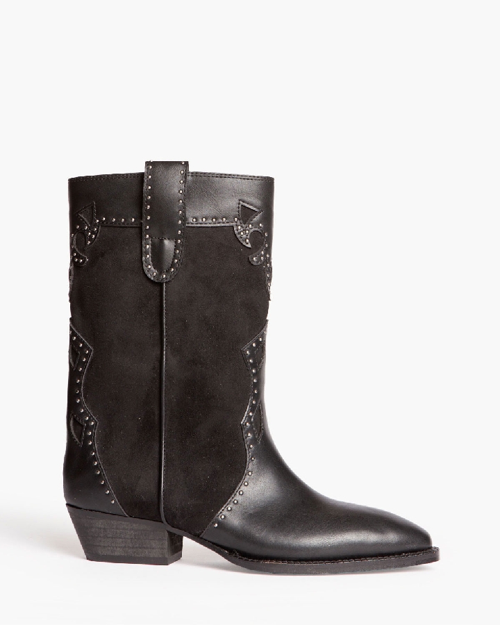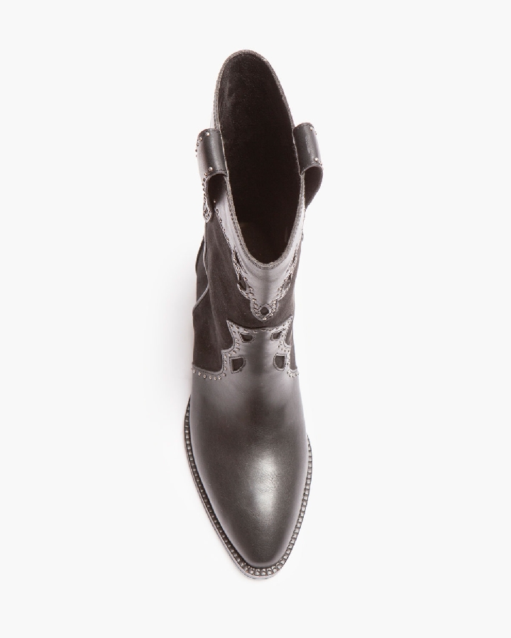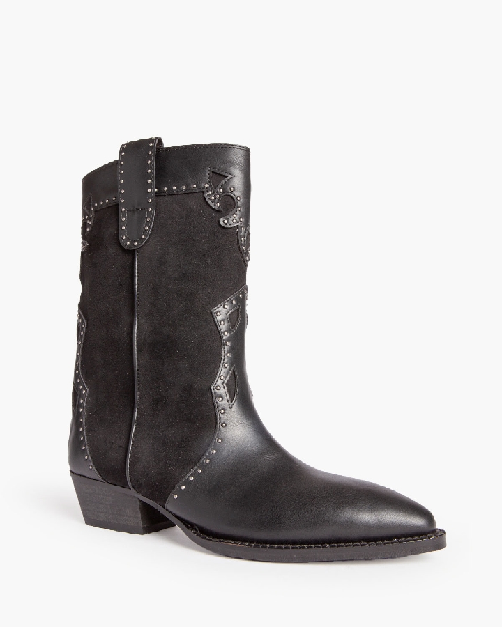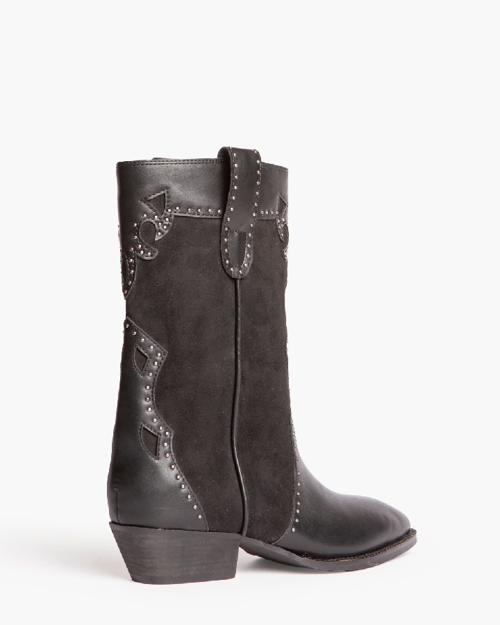 Botín estilo cowboy. Caña y puntera con detalles bordados. Tachas en la caña y en los tiradores. Acabado en punta. Cremallera en el lateral interior.