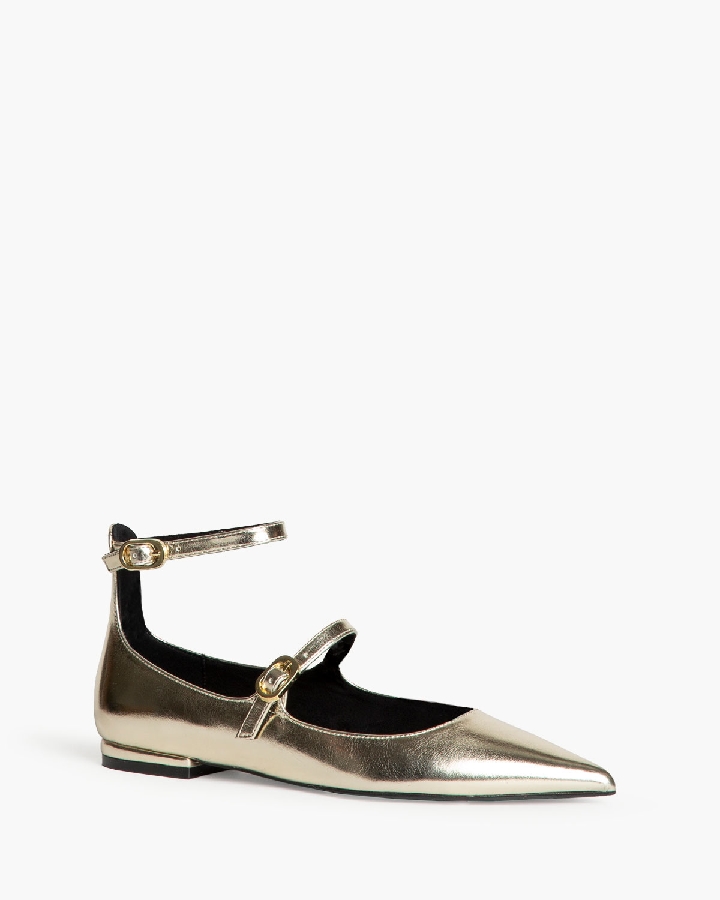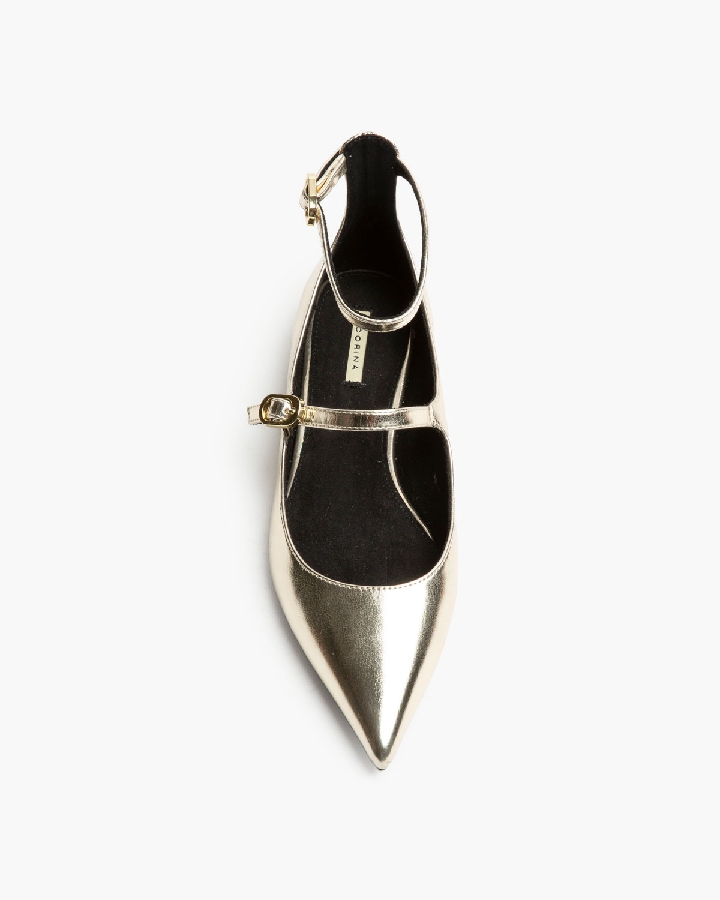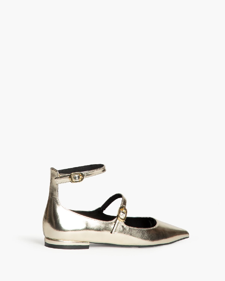 Bailarina plana tipo mary jane. Cierre mediante hebilla en la pulsera del empeine y tobillo. Acabado en punta.