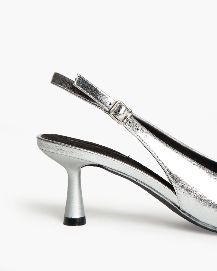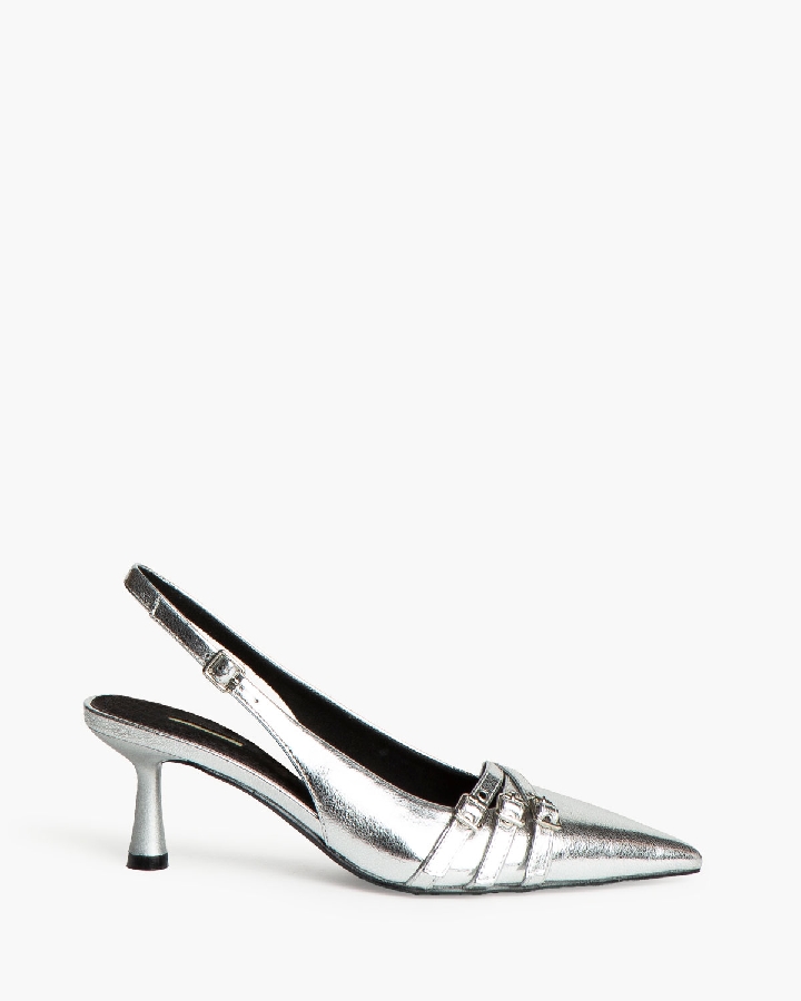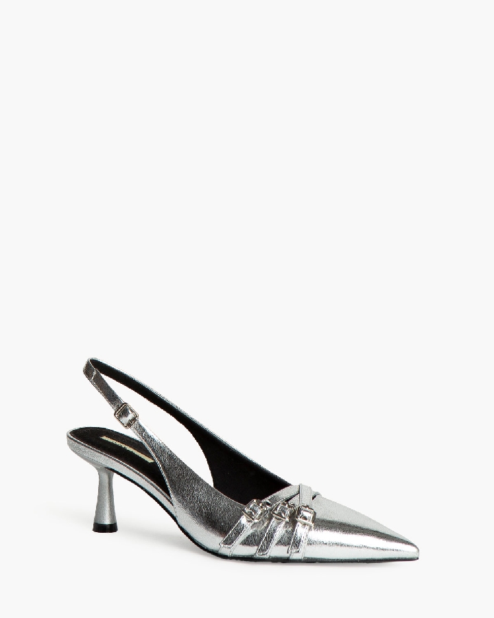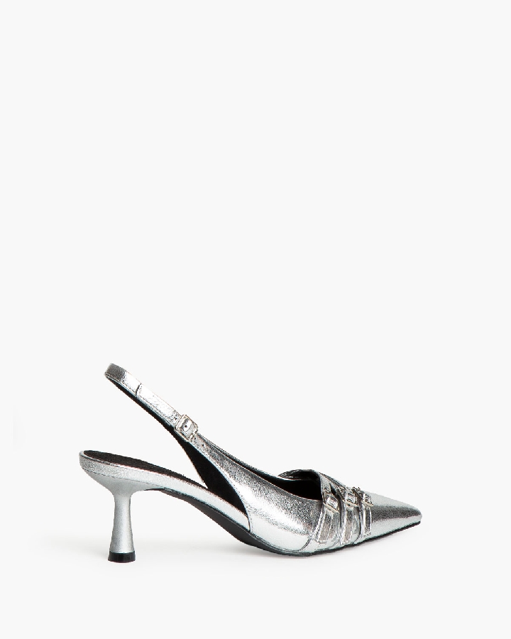 Salón destalonado. Acabado en punta. Detalle de tiras finas con hebi-Ilas en la parte delantera. Tira trasera con hebilla.