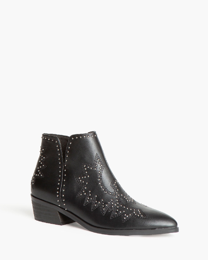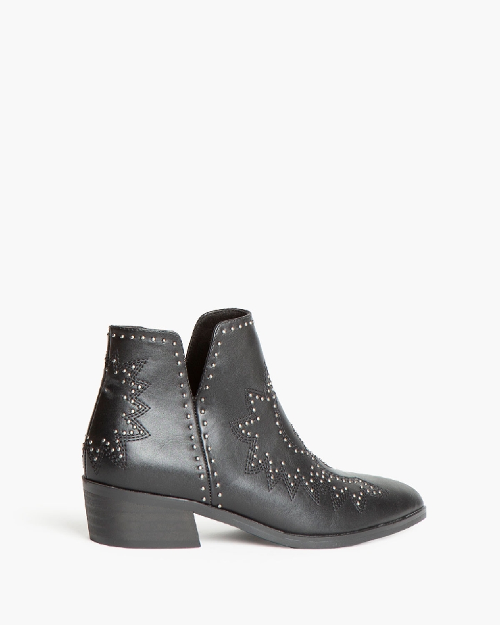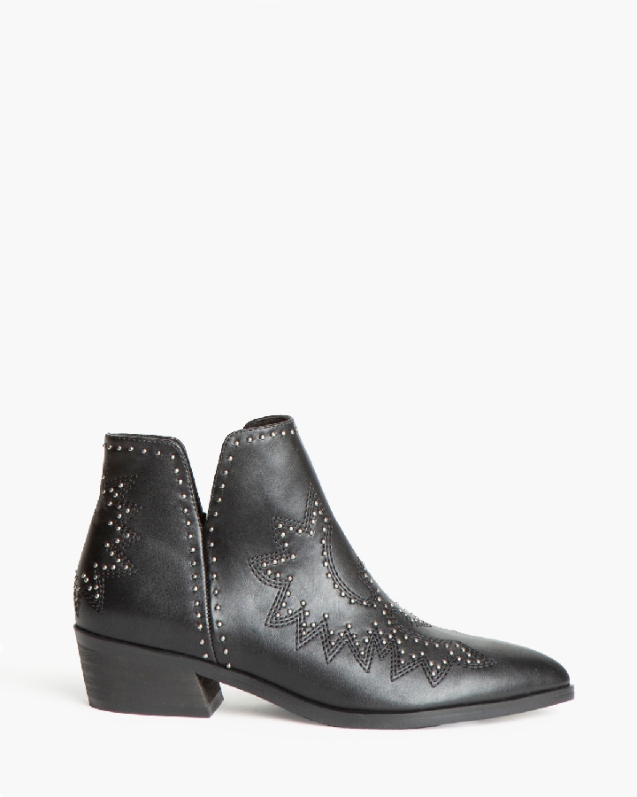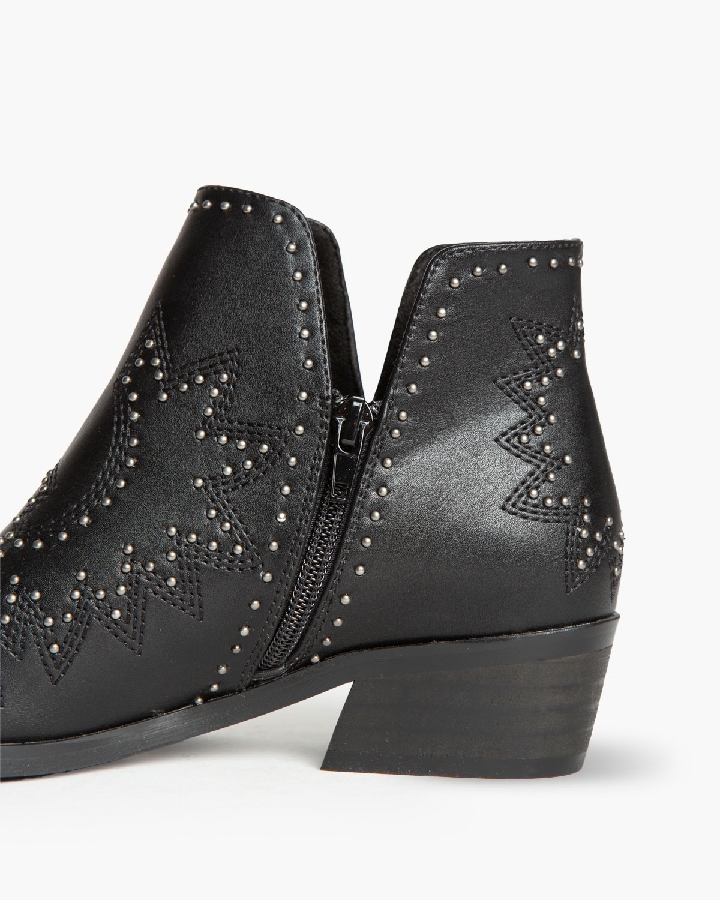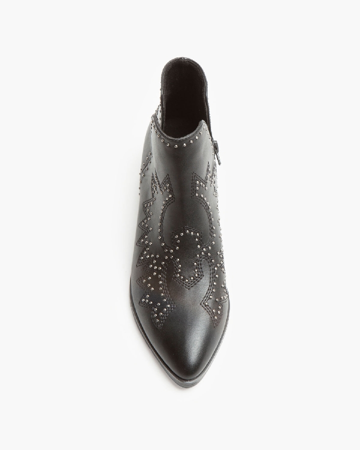 Botín de tacón bajo con aberturas en los laterales. Corte con detalle bordado con tachas. Cremallera en el lateral interior.