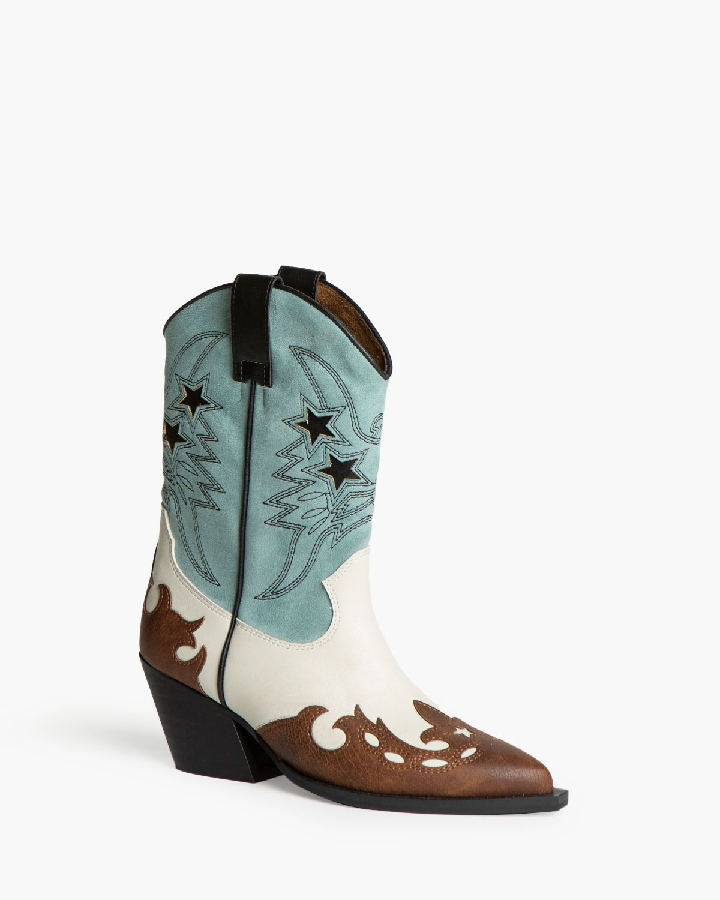 Botín estilo cowboy. Tiradores en los laterales. Acabado en punta. Corte en mezcla de materiales y colores. Cremallera en el lateral interior.