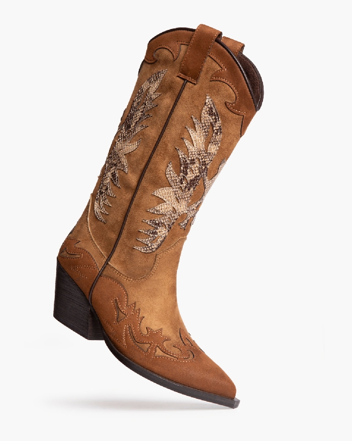 Bota estilo cowboy. Corte en contraste de materiales y colores. Tiradores en los laterales. Acabado en punta. Cremallera en el lateral interior.