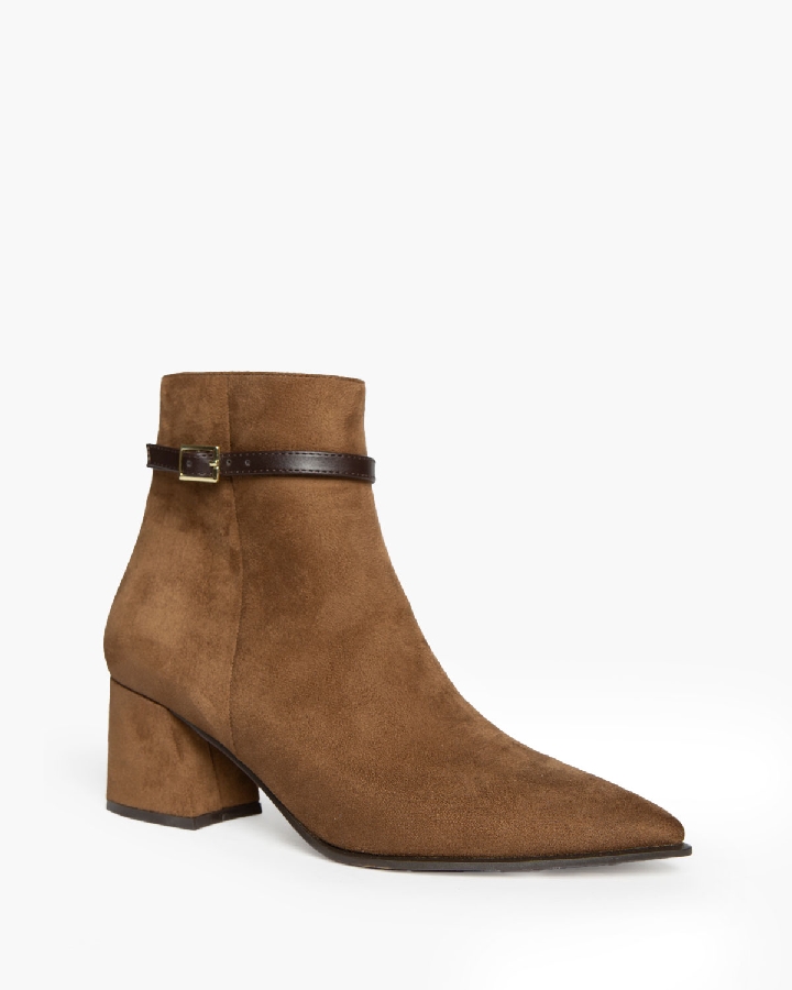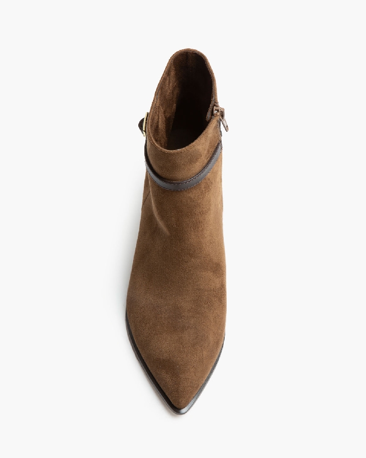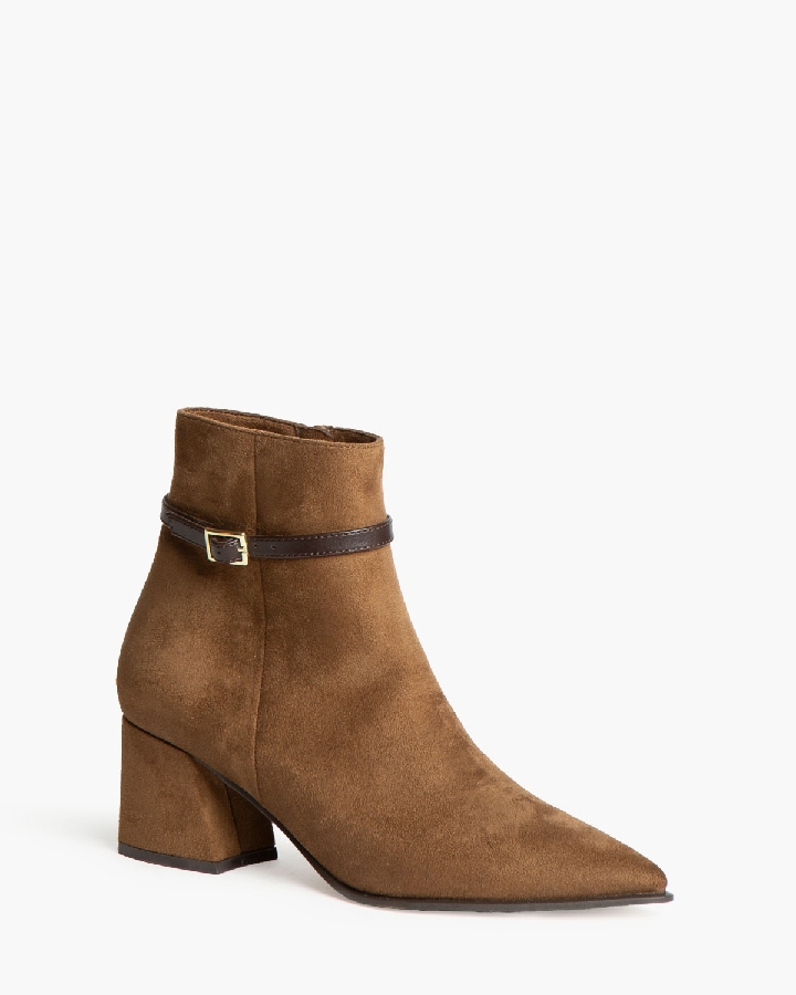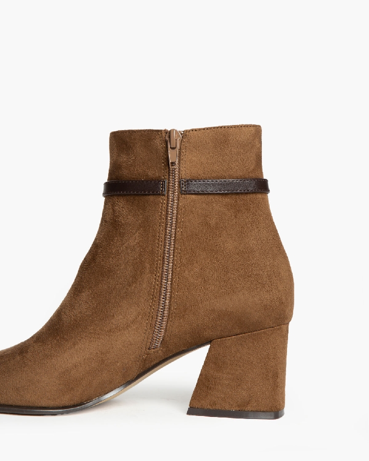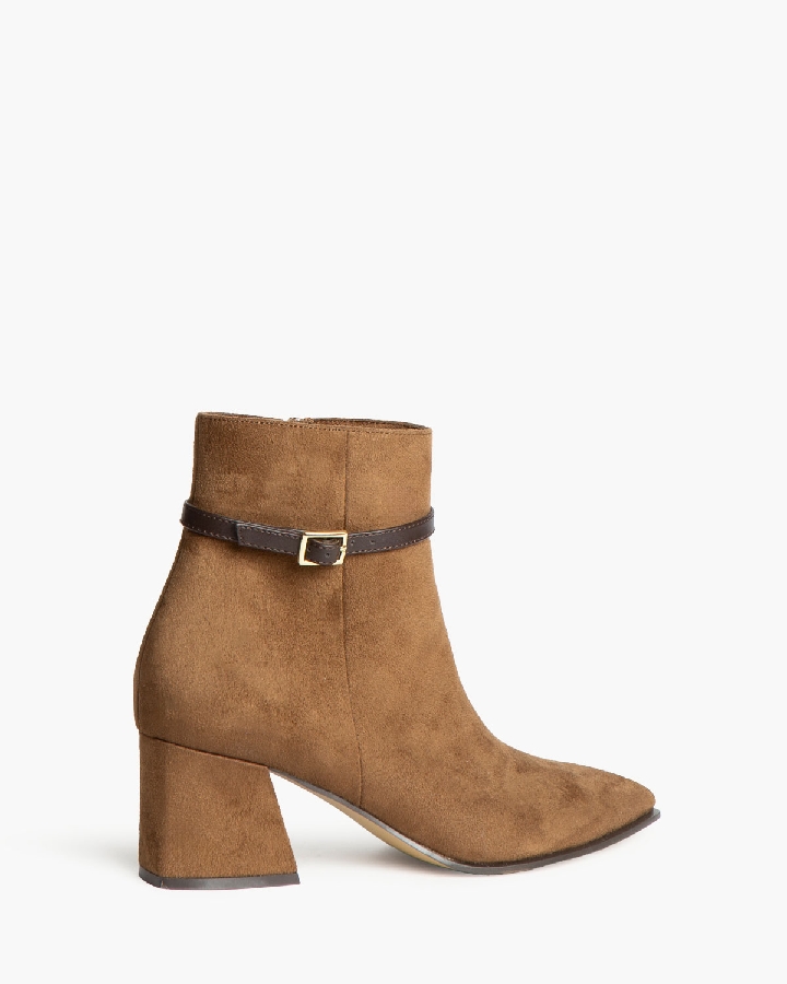 Botín de tacón medio. Detalle de tira fina con hebilla en la parte superior de la caña. Cremallera en la parte lateral interior. Tacón acho.