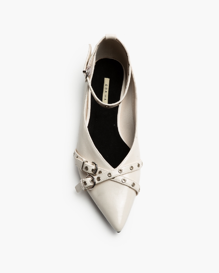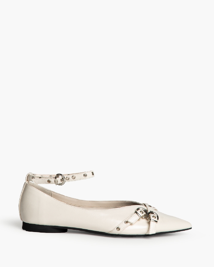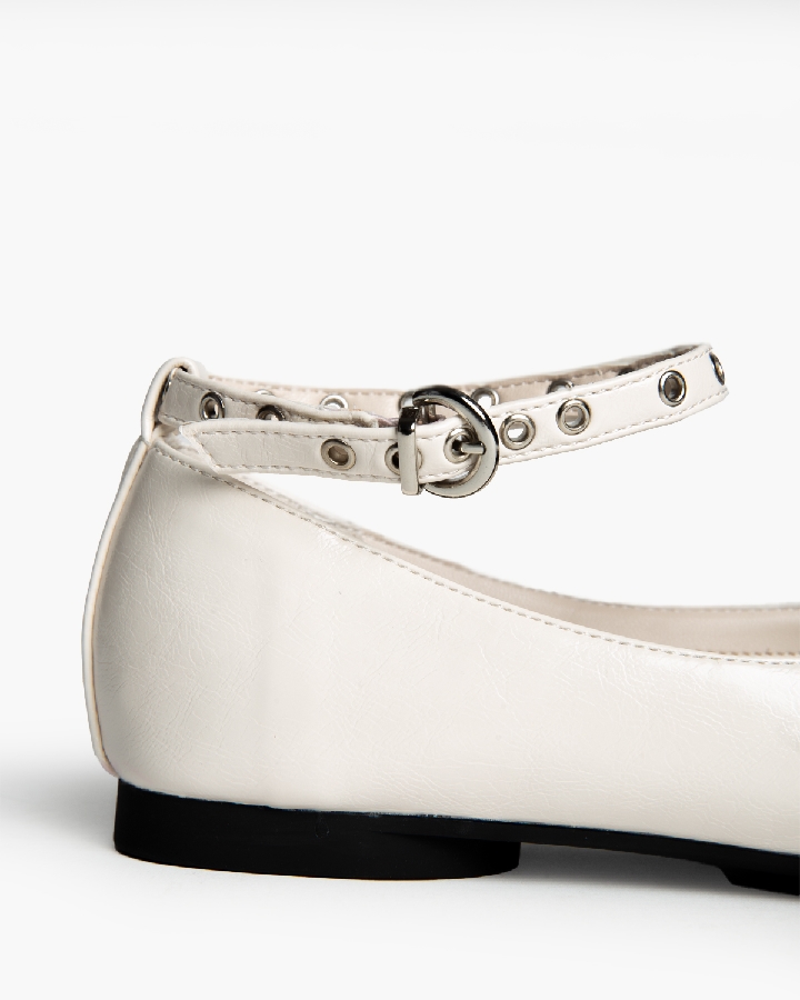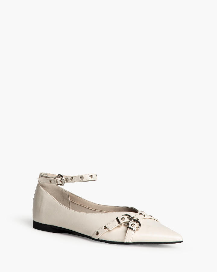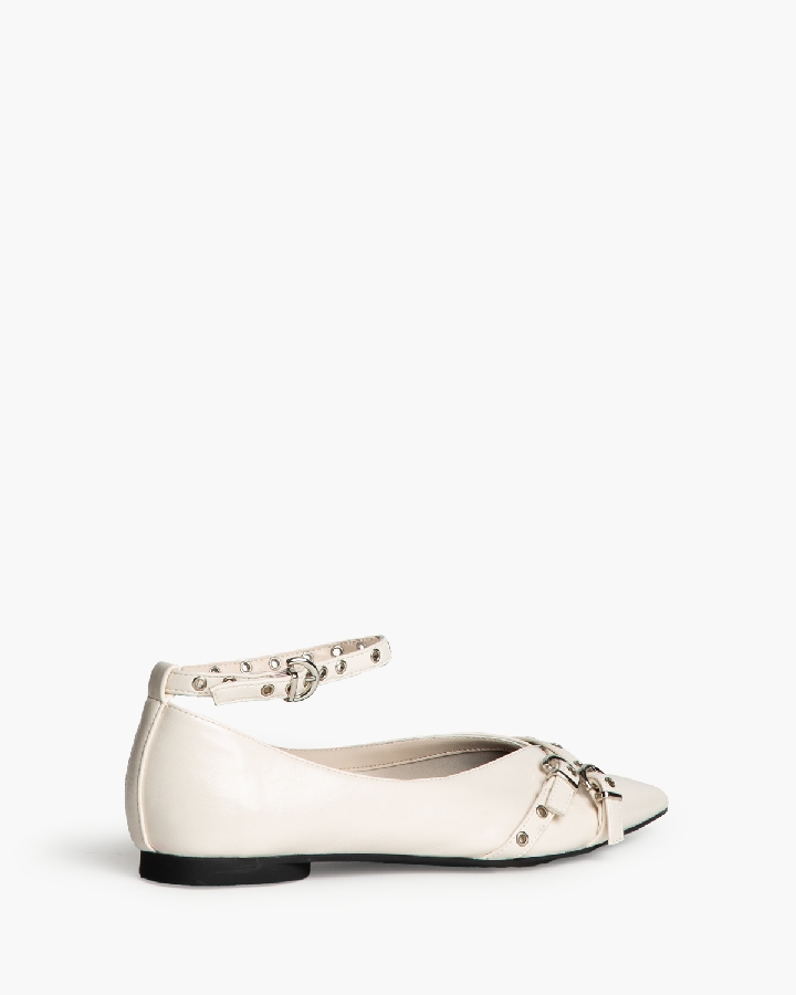Bailarina plana. Acabado y escote en punta. Detalle de hebilla y ojales metálicos en la parte delantera. Cierre mediante pulsera al tobillo.