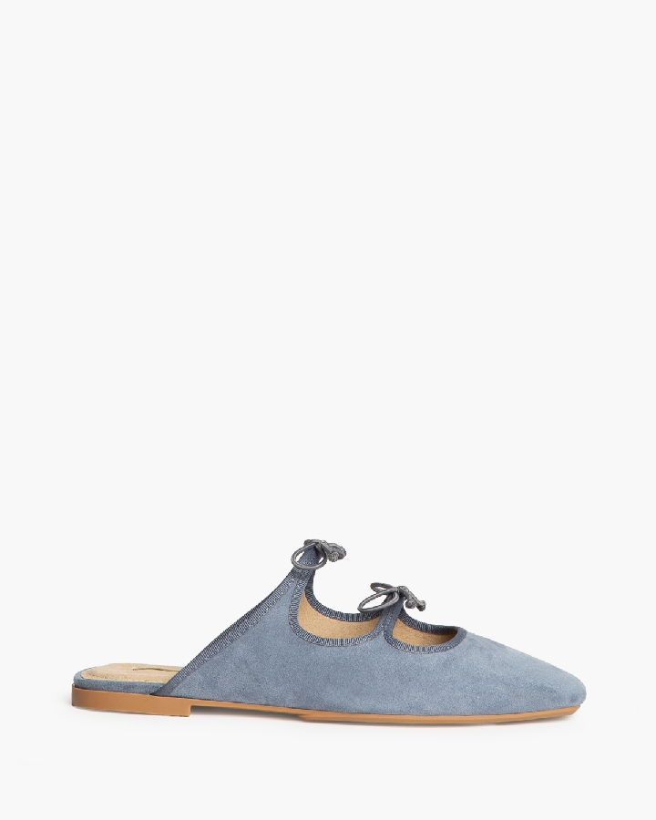 Bailarina tipo mule. Punta y corte redondo. Borde ribeteado. Detalle de lazos en el empeine.