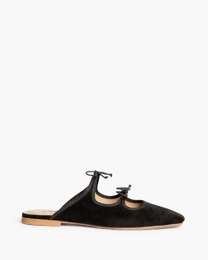 Bailarina tipo mule. Punta y corte redondo. Borde ribeteado. Detalle de lazos en el empeine.