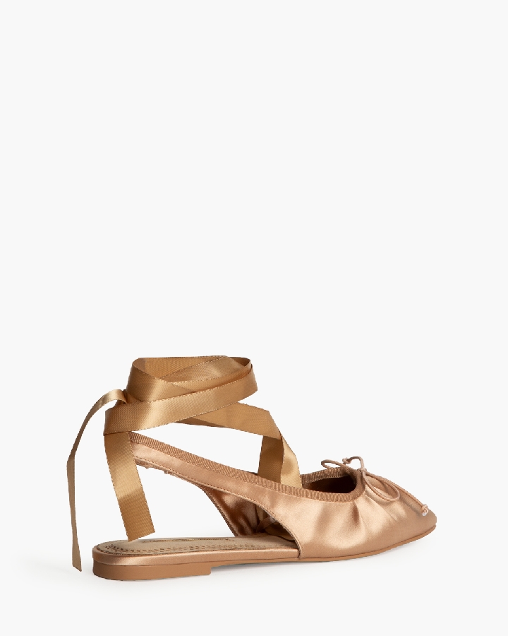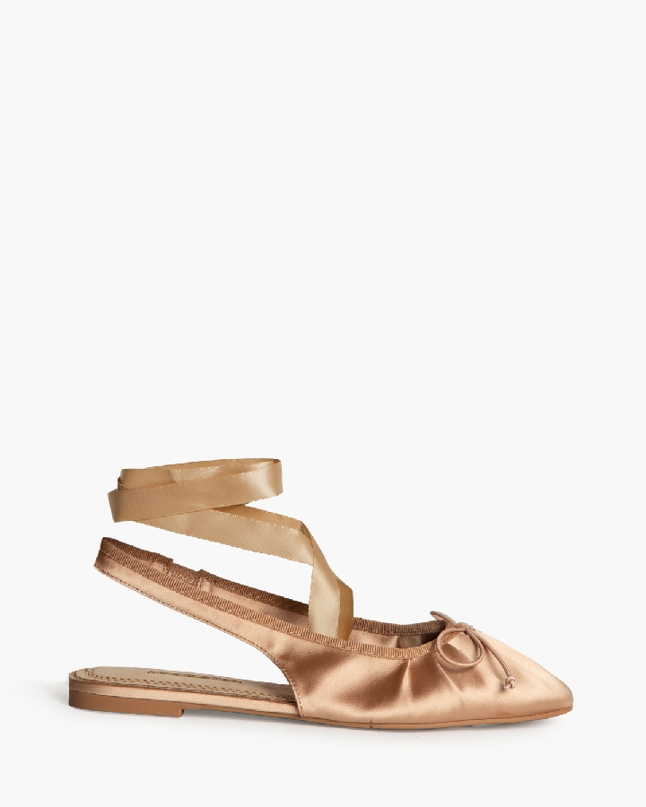Bailarina destalonada. Detelle fruncido en la punta. Elastico en la parte interior. Cierre mediante lazo al tobillo. Lazoo en la parte delantera.