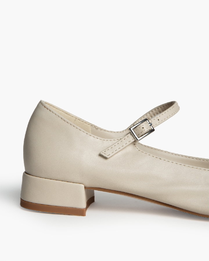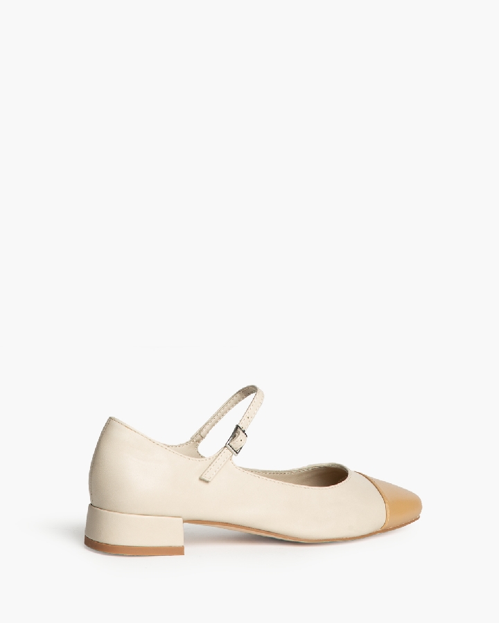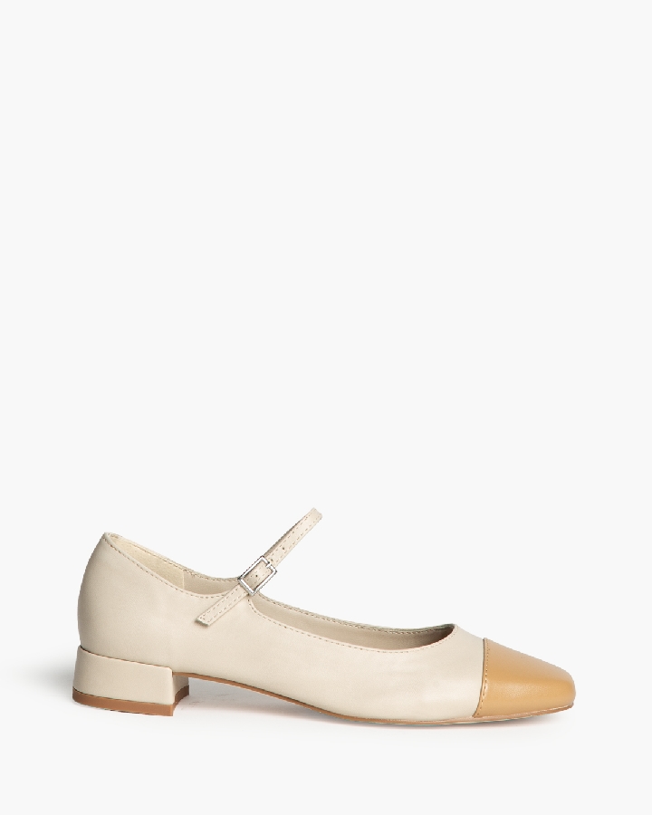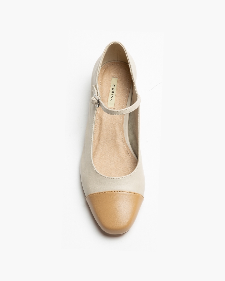 Bailarina tipo Mery jane de tacón bajo. Detalle en la puntera. Corte en combinación de colores en contraste. Punta redonda. Cierre mediante hebilla en la tira del empeine.