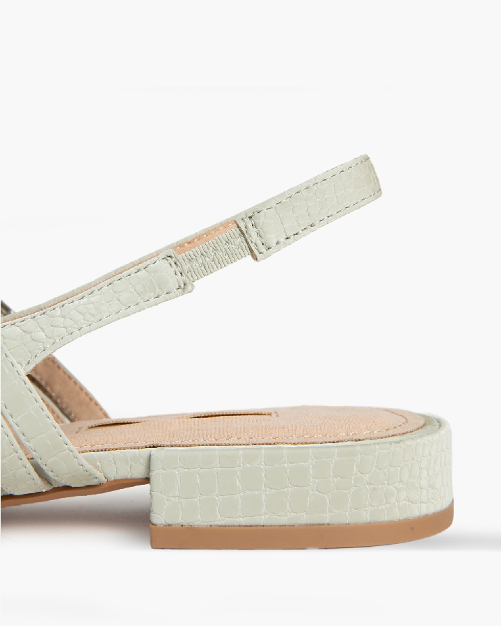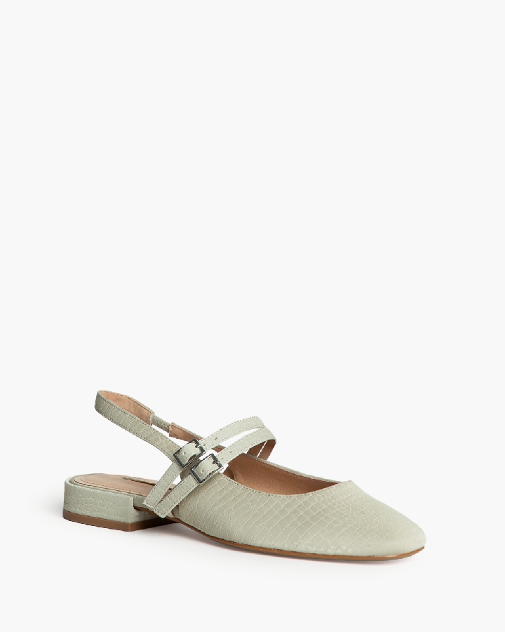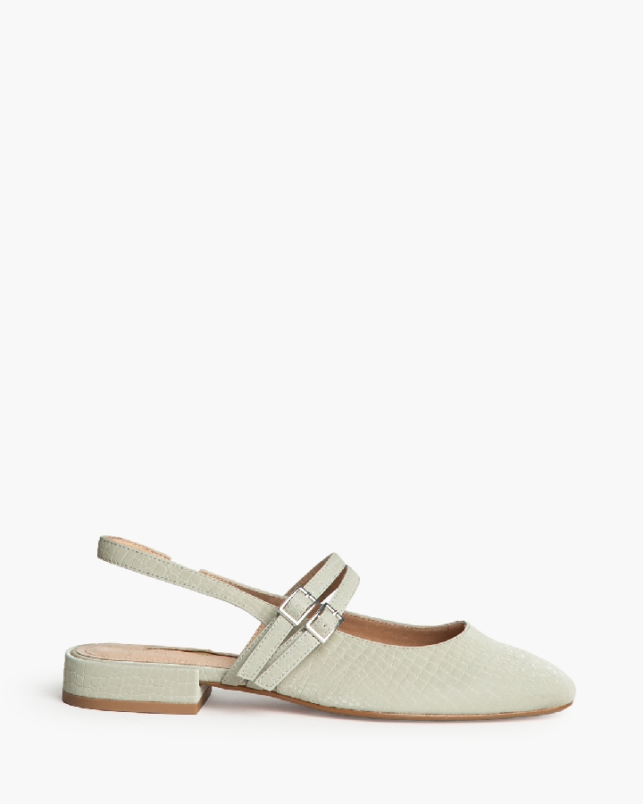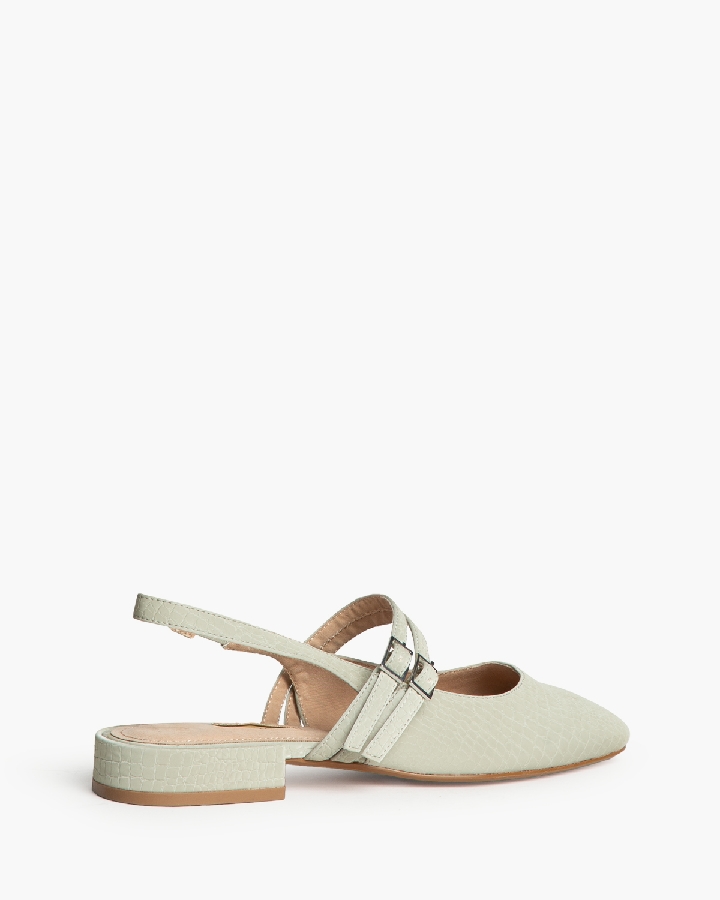 Bailarina merceditas destalonada. Cierre mediante hebillas en la tira del empeine y lazo tira trasera. Tacón bajo ancho.
