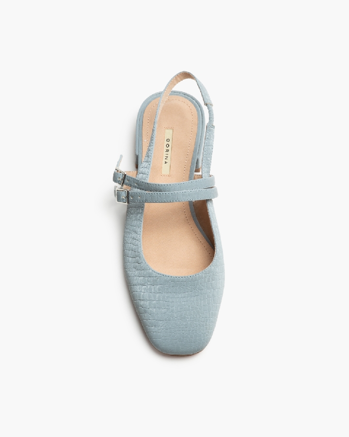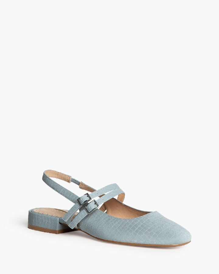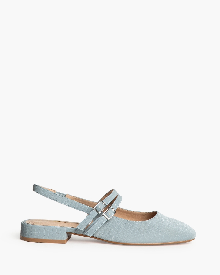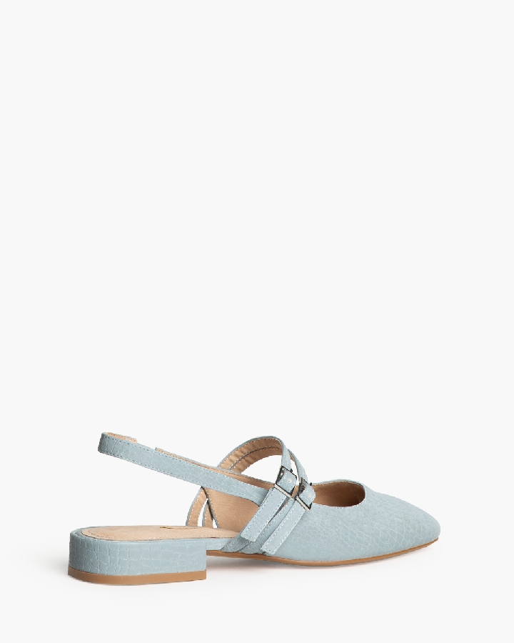 Bailarina merceditas destalonada. Cierre mediante hebillas en la tira del empeine y lazo tira trasera. Tacón bajo ancho.