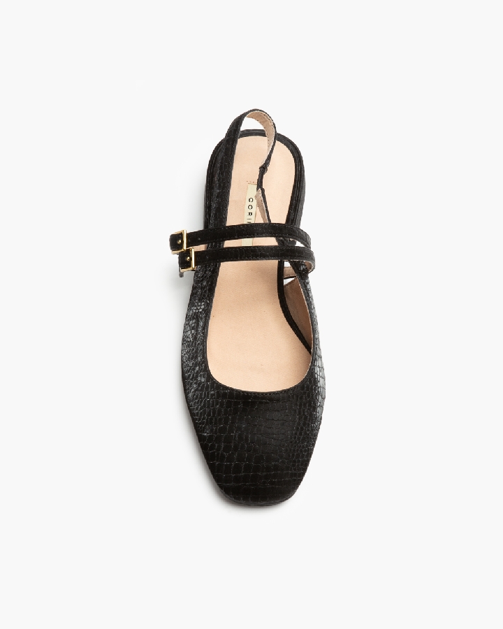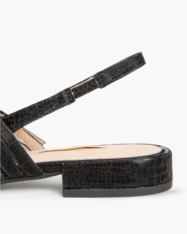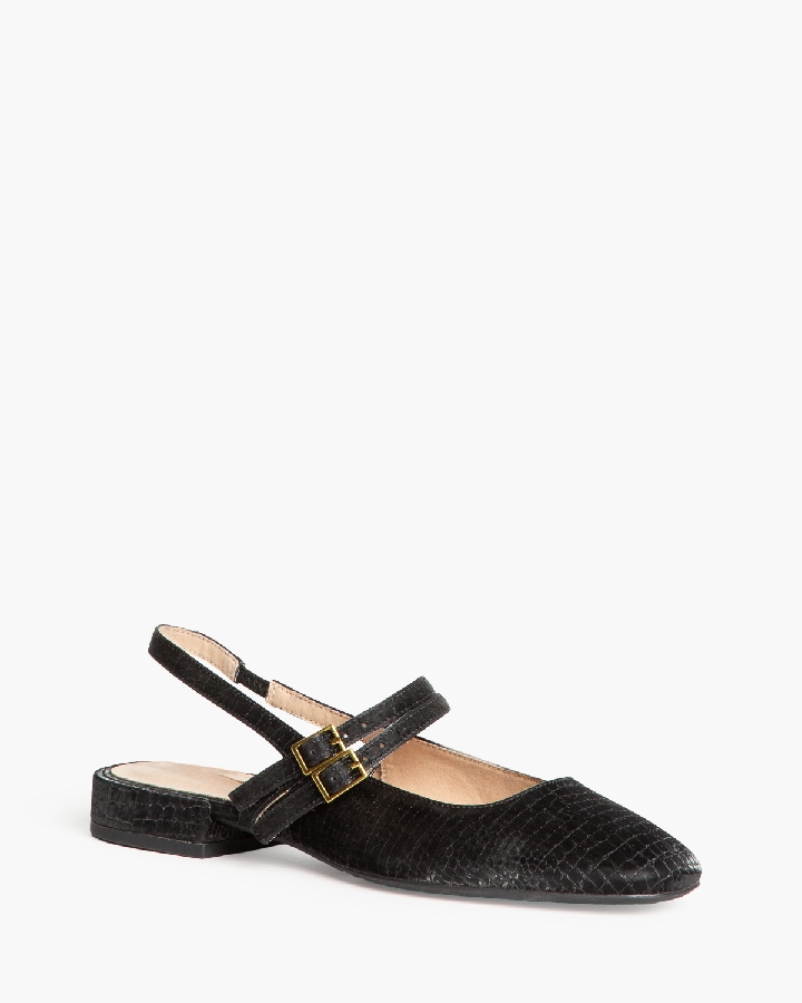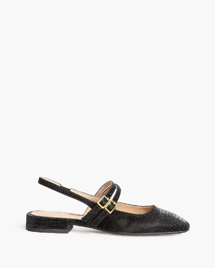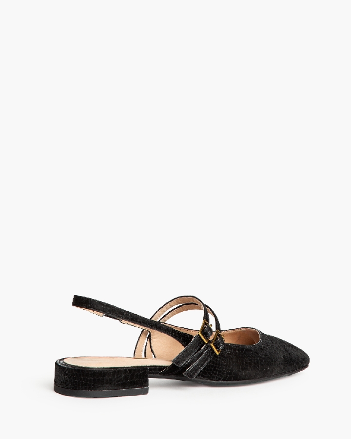 Bailarina merceditas destalonada. Cierre mediante hebillas en la tira del empeine y lazo tira trasera. Tacón bajo ancho.