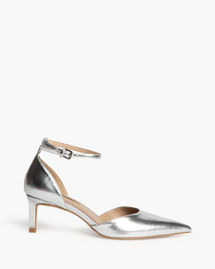 Salón de tacón medio. Cierre mediante hebilla en la pulsera del tobillo. Acabado en punta. Escote redondo, tacón fino.