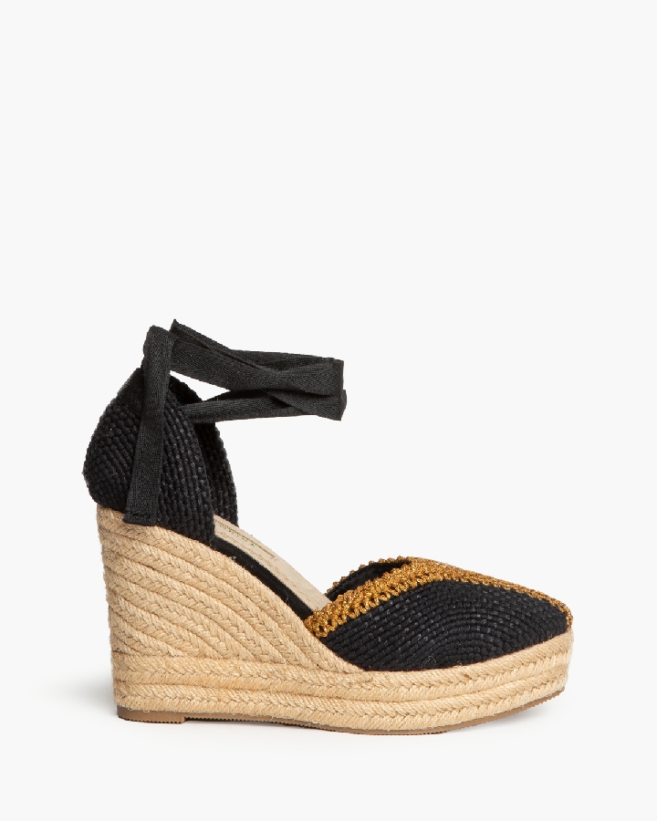 Plataforma tipo valenciana, con cuña en vute. Corte con detalle de pasamaneria. Cierre mediante tiras anudadas al tobillo.