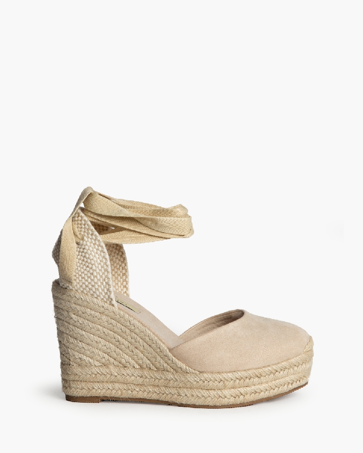Plataforma tipo valenciana, con cuña en yute. Cierre mediante tiras anudadas al tobillo.