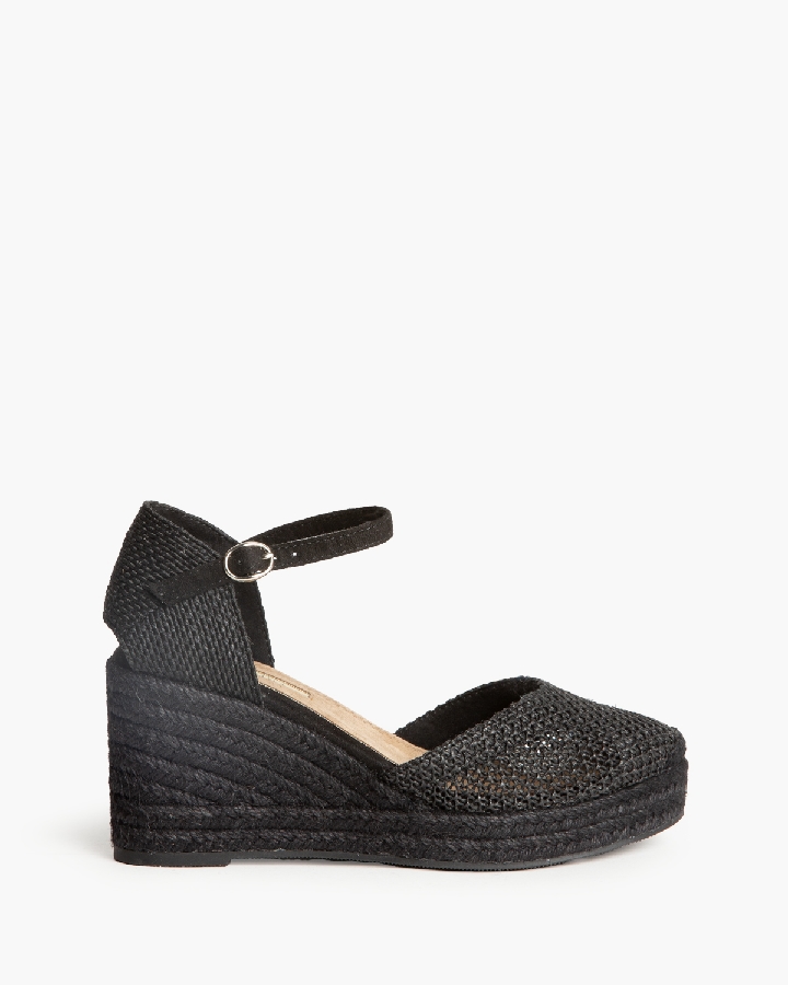 Plataforma tipo valenciana, con cuña en yute. Cierre hebilla en la tira del talón. Corte tipo ganchillo.