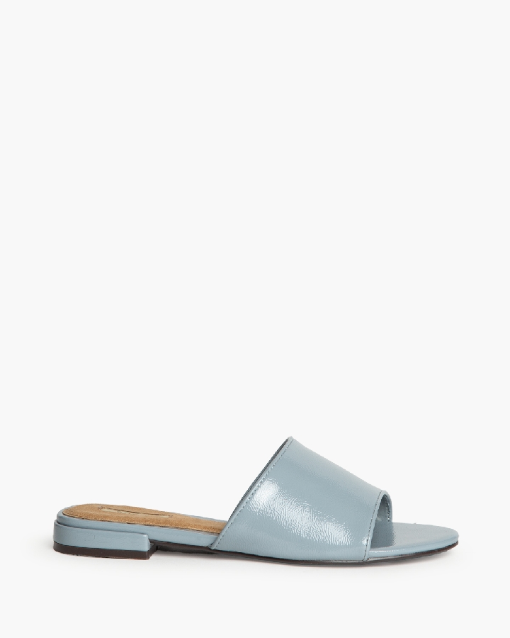 Sandalia plana. Tira ancha en la parte delantera. Punta redonda.