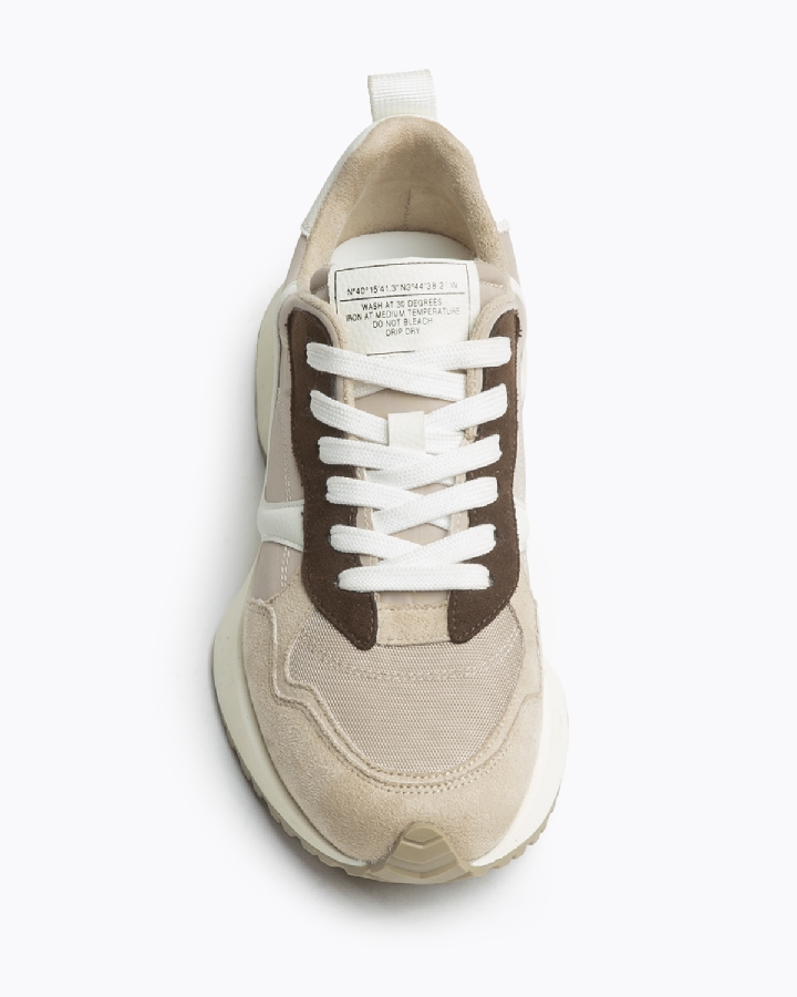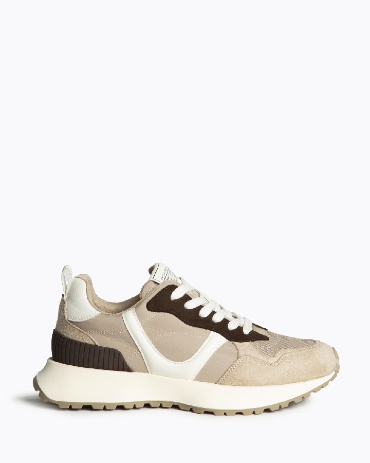 Zapatilla deportiva estilo running. Suela dentada y cierre mediante cordones de seis pasadas. Corte en combinación de materiales y colores.