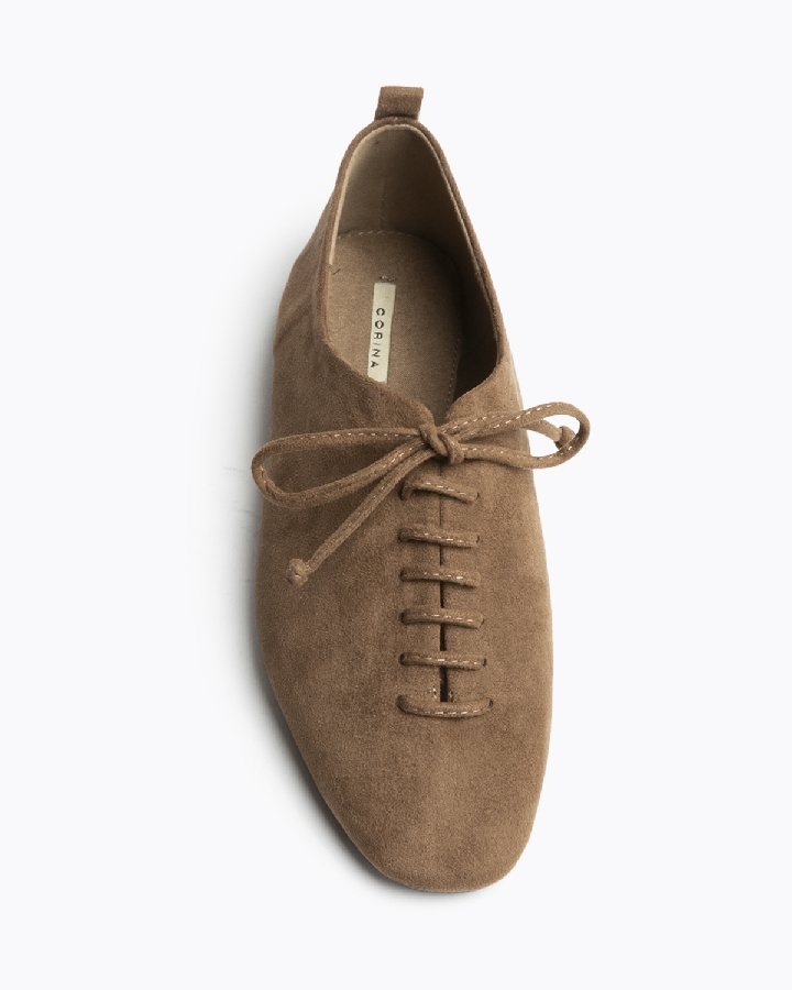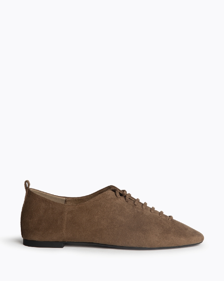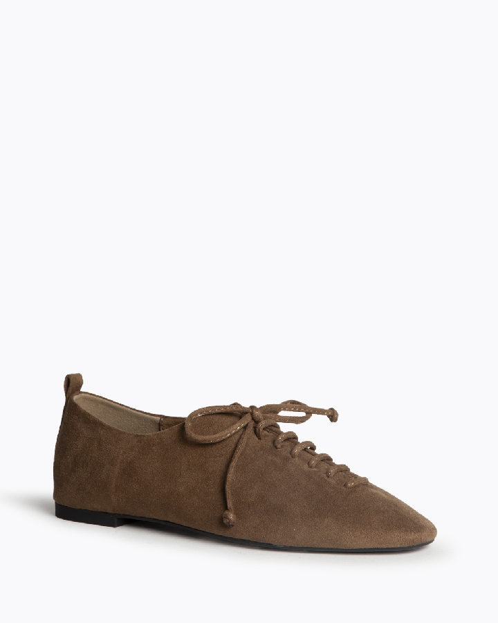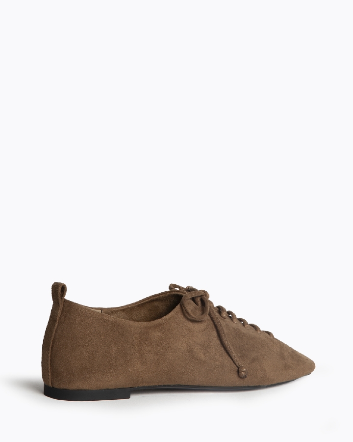 Zapato plano. Cierre mediante cordones de siete pasadas. Corte tipo antelina.