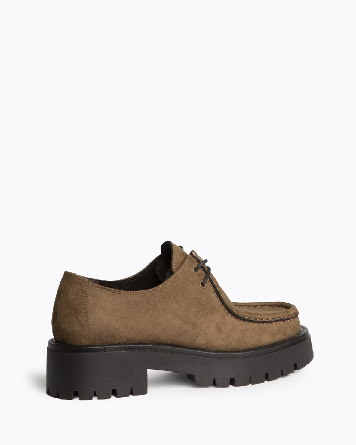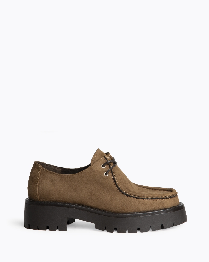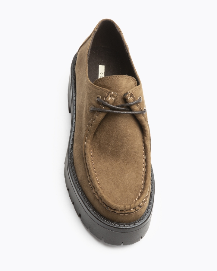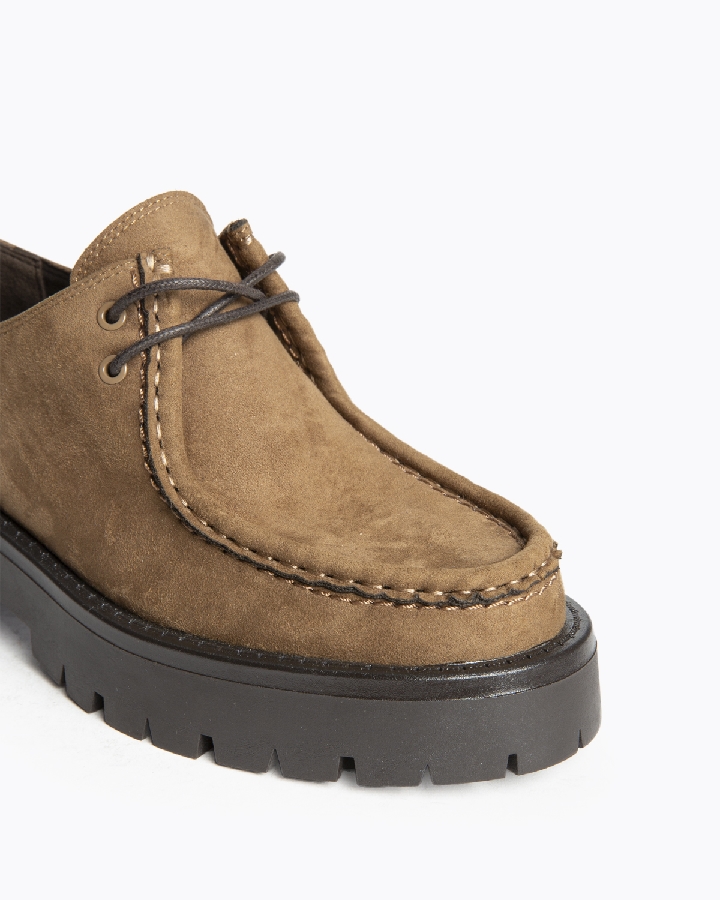 Mocasín con cordones tipo Wallabee. Suela dentada. Cierre mediante cordones de dos pasadas.