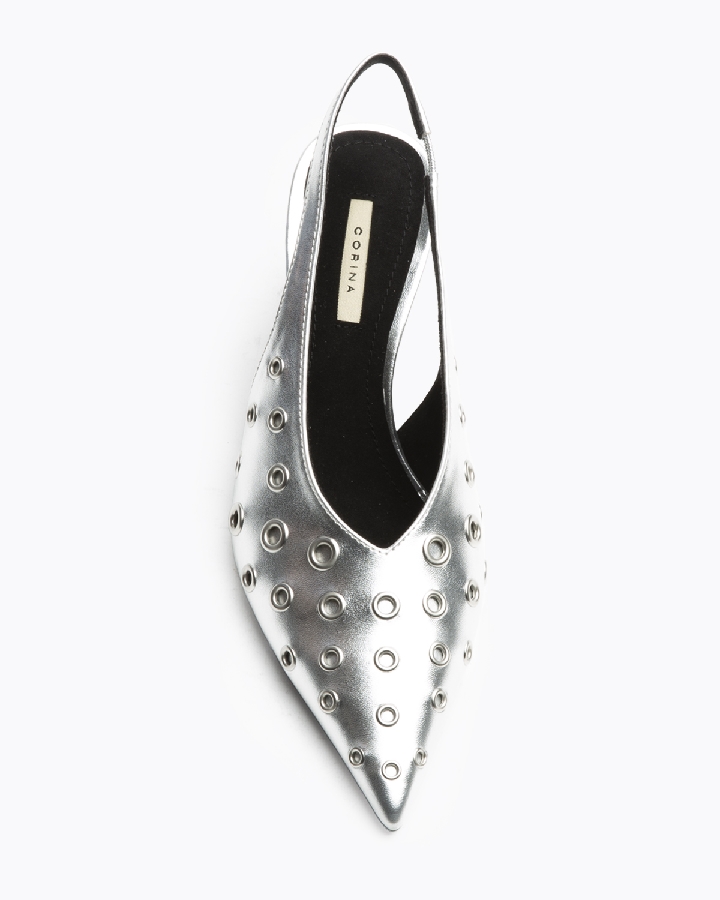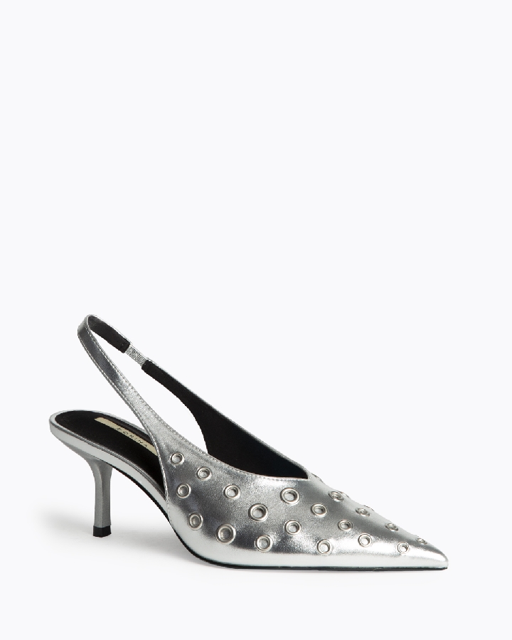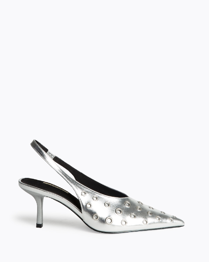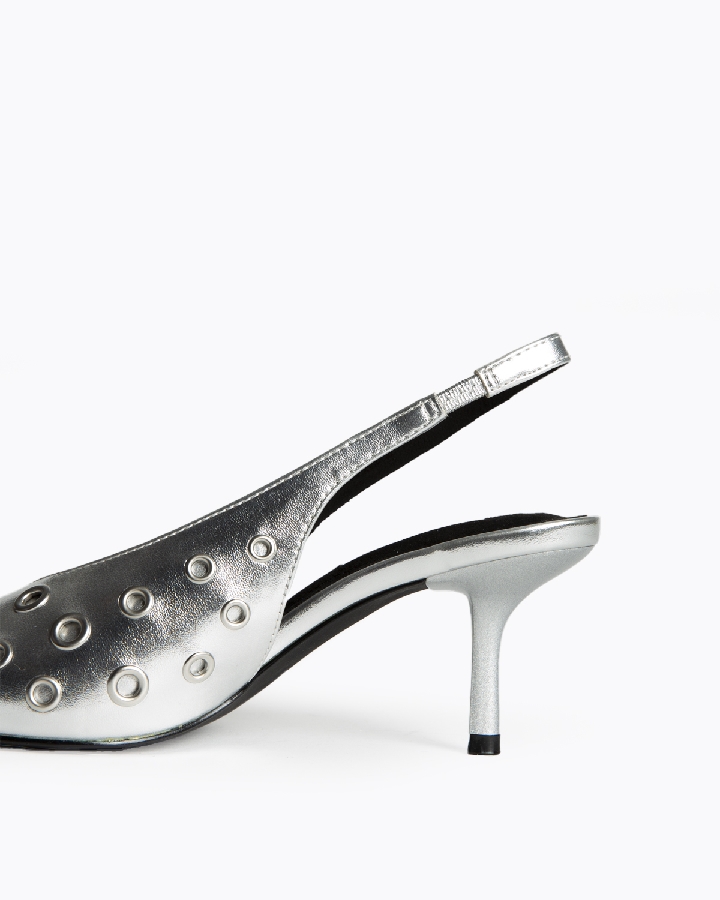 Salón de tacón fino, destalono. Elástico en el lateral interior. Acabado en punta. Escote en pico. Ojales de distintos tamaños en el corte.