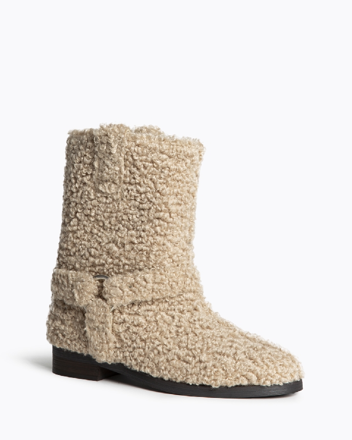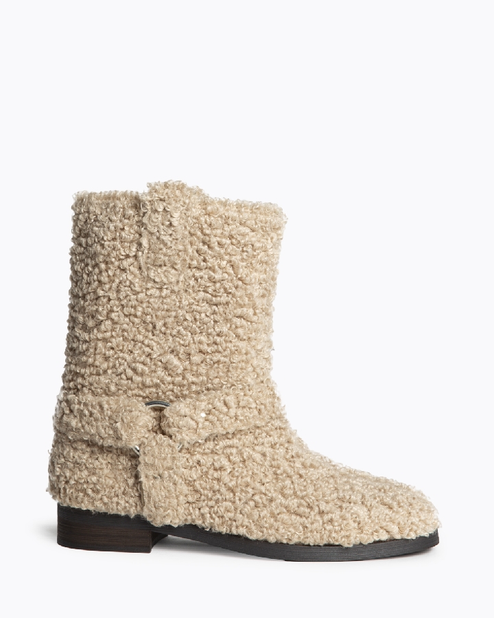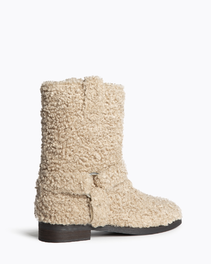 Botín plano estilo biker. Acabado en punta redonda. Detalle de espo-lón. Tiradores en los laterales. Cremallera en el lateral interior. Corte