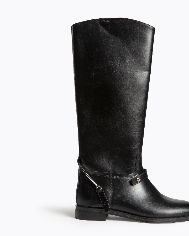 Bota plana, estilo hípica. Cremallera en el lateral. Caña lisa, espolón desmontable. Acabado en punta redonda.