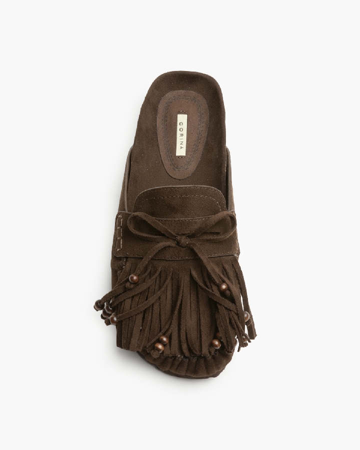 Zueco plano. Suela ergonómica, punta redonda. Antifaz con detalle de flecos. Fruncidos en la puntera.