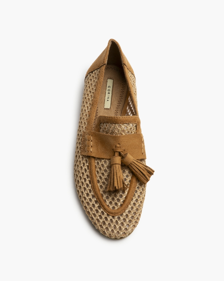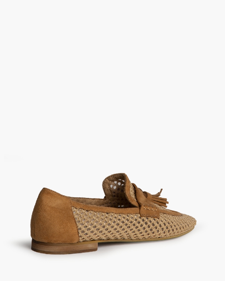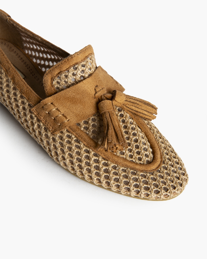 Mocasin plano. Corte trenzado. Copete subido, detalle de borlas.