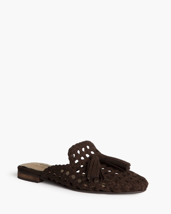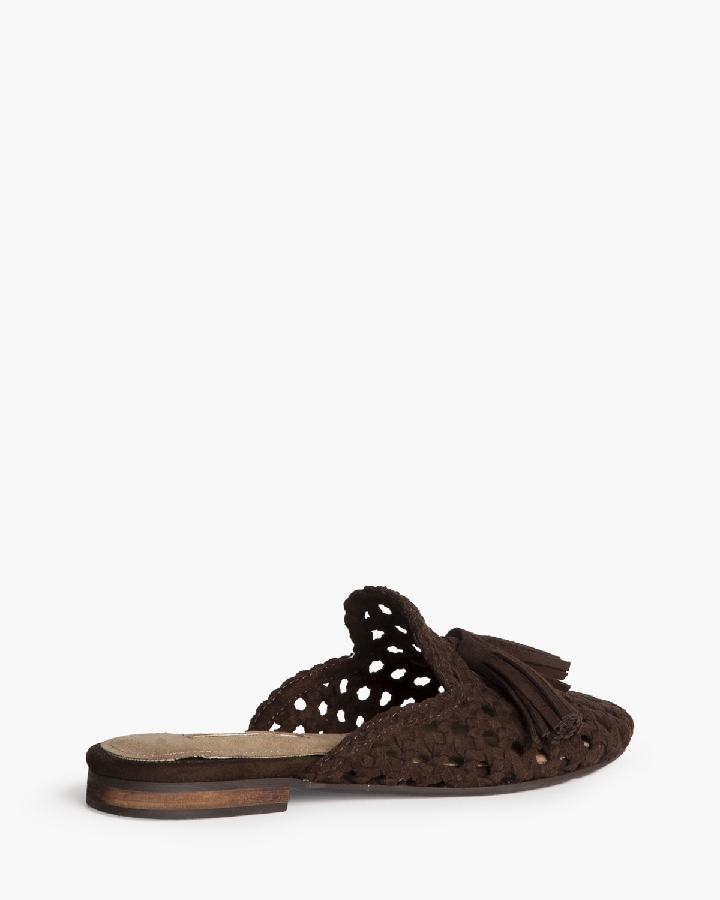 Mule plano. Corte trenzado. Detalle de borlas en la parte delantera.