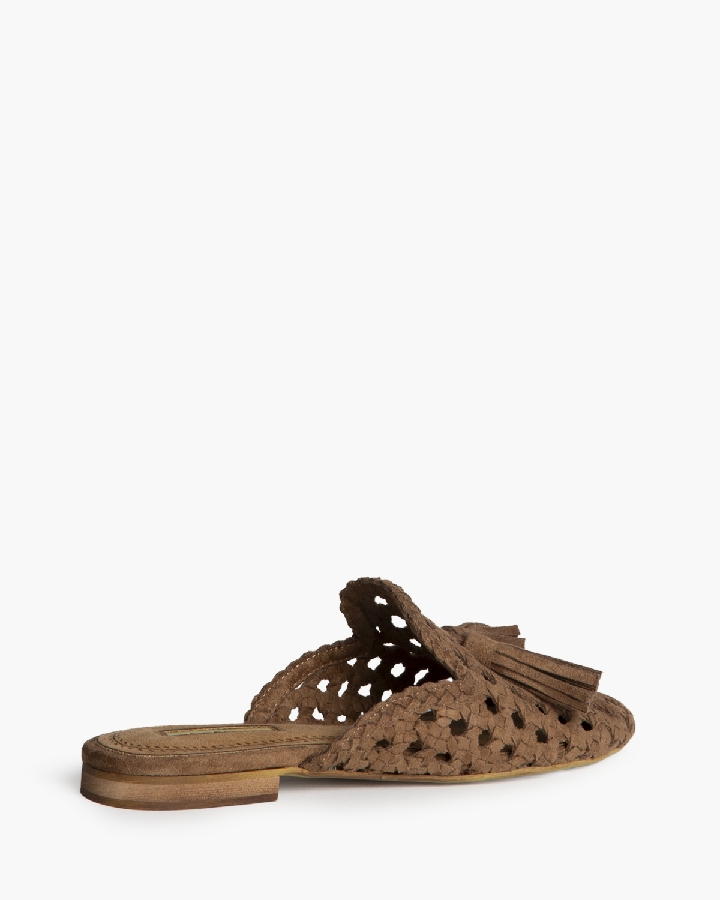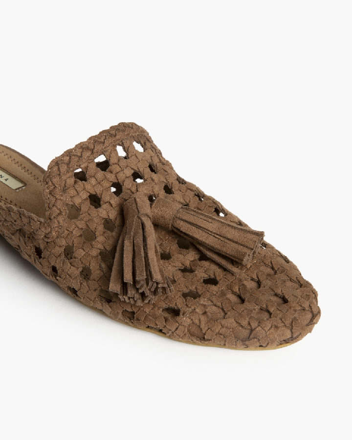 Mule plano. Corte trenzado. Detalle de borlas en la parte delantera.