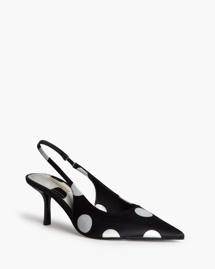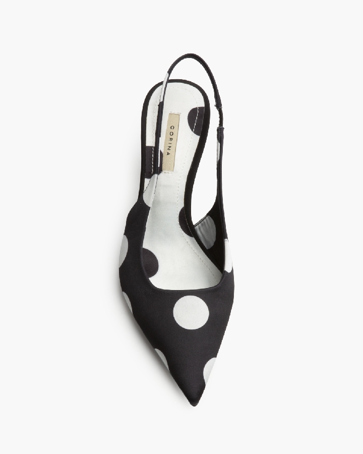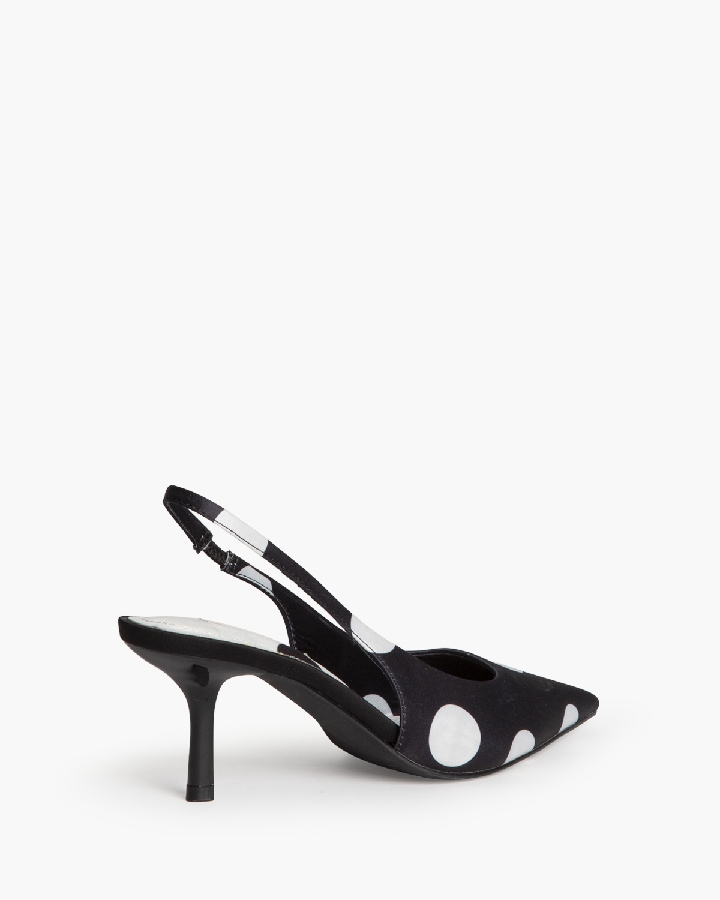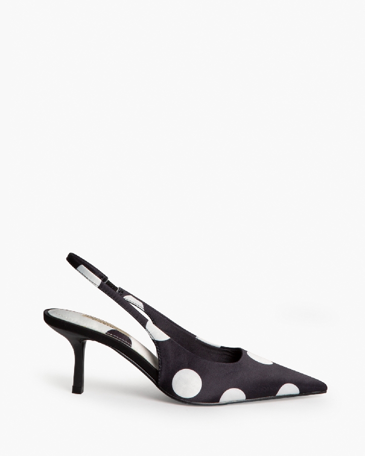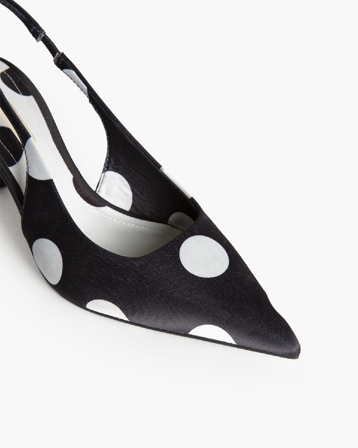 Salón de tacón medio, corte en satén, con polka dot . Acabado en punta. Elástico en la parte interior.
