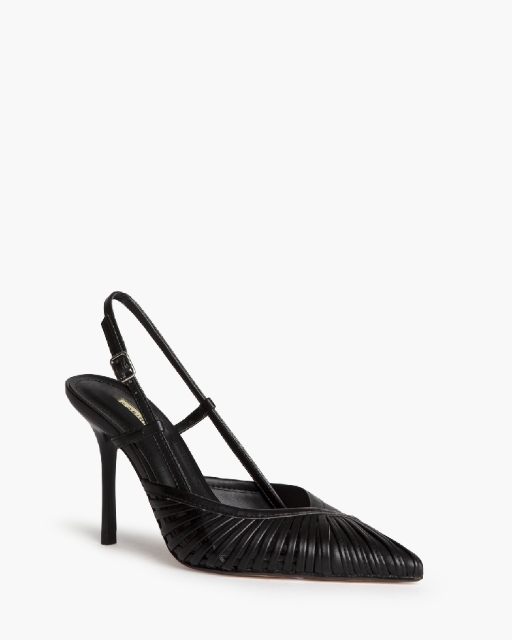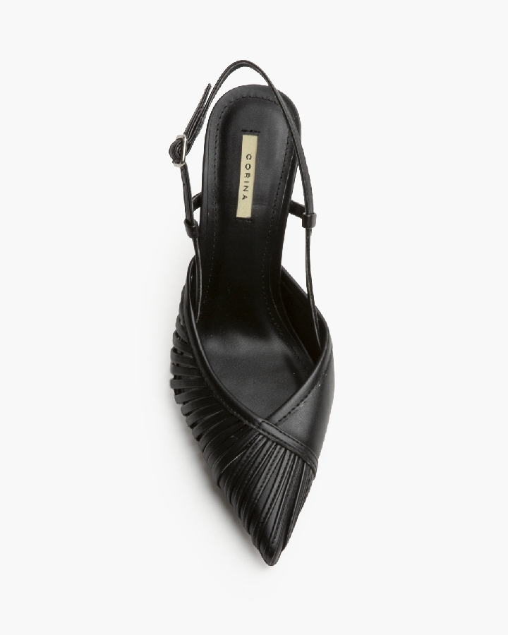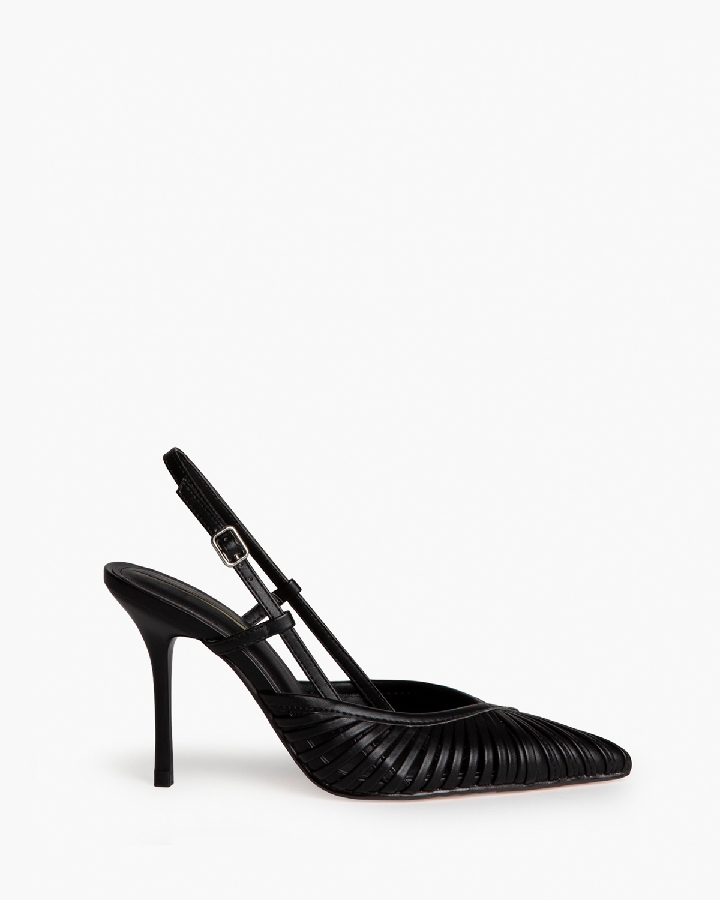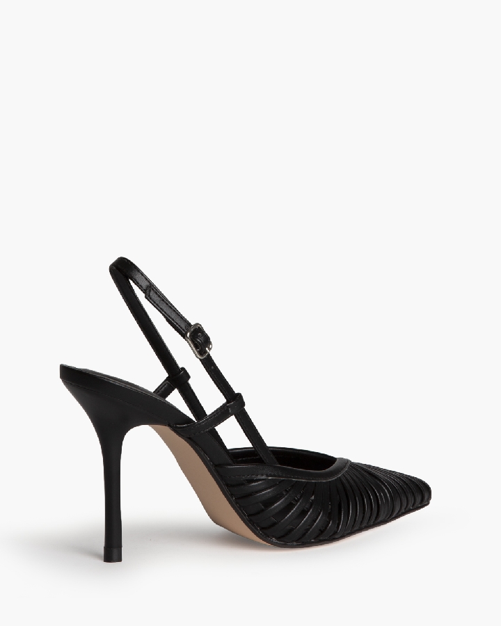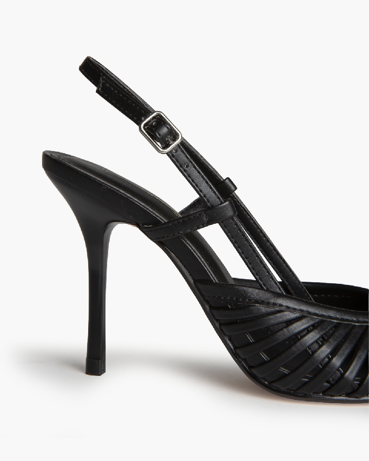 Salón destalonado de tacón fino. Detalle de tiras cruzadas en la parte delantera. Cierre mediante hebilla en la parte exterior.