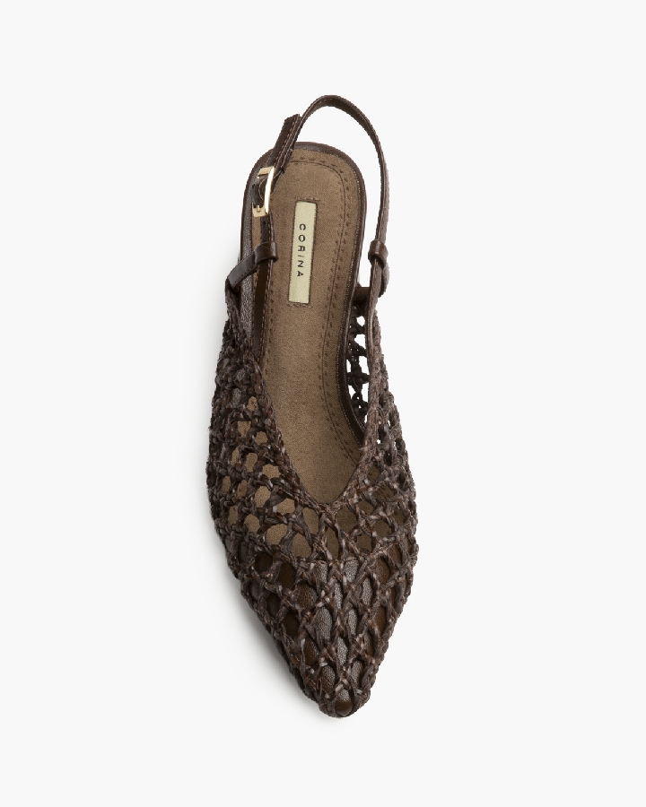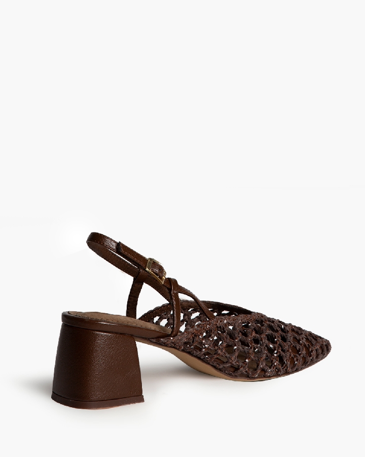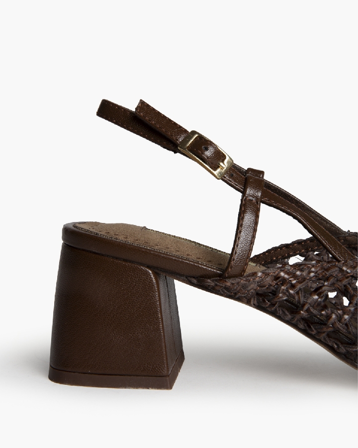 Zapato de tacón medio destalonado. Corte trenzado. Acabado en punta. Cierre mediante hevibilla en la parte exterior.