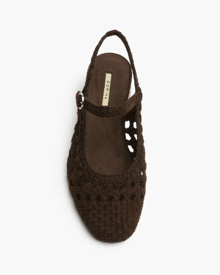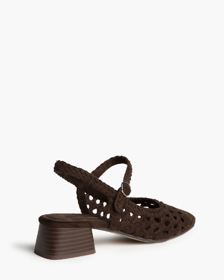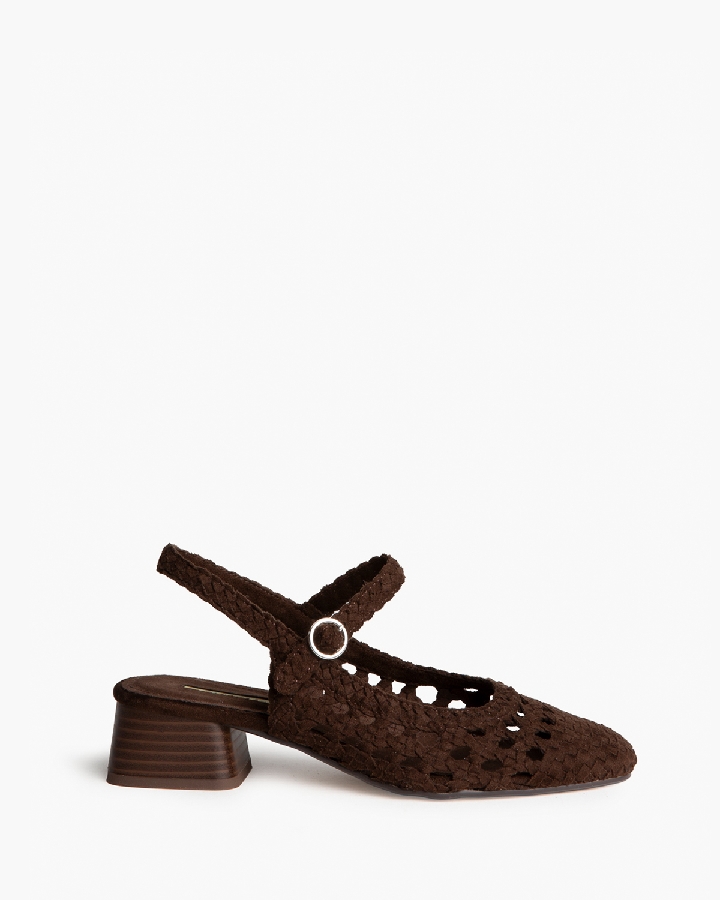 Sandalia de tacón bajo. Corte trenzado. Tacón ancho y acabado en punta redonda. Hebilla en el empeine.