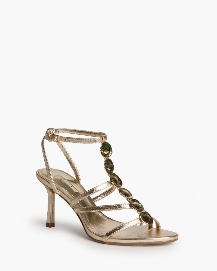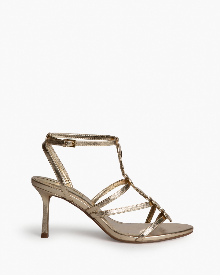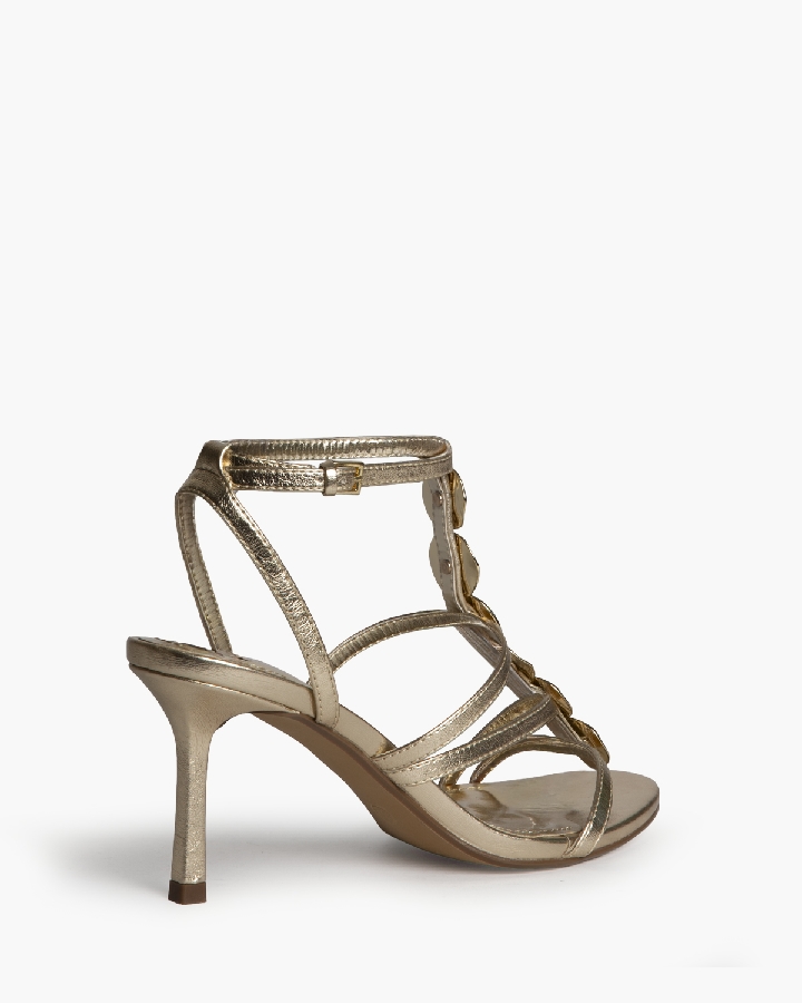 Sandalia de tacón alto. Adorno de chapas en el empeine. Cierre mediante hebilla en la pulsera del tobillo. Acabado en punta redonda.