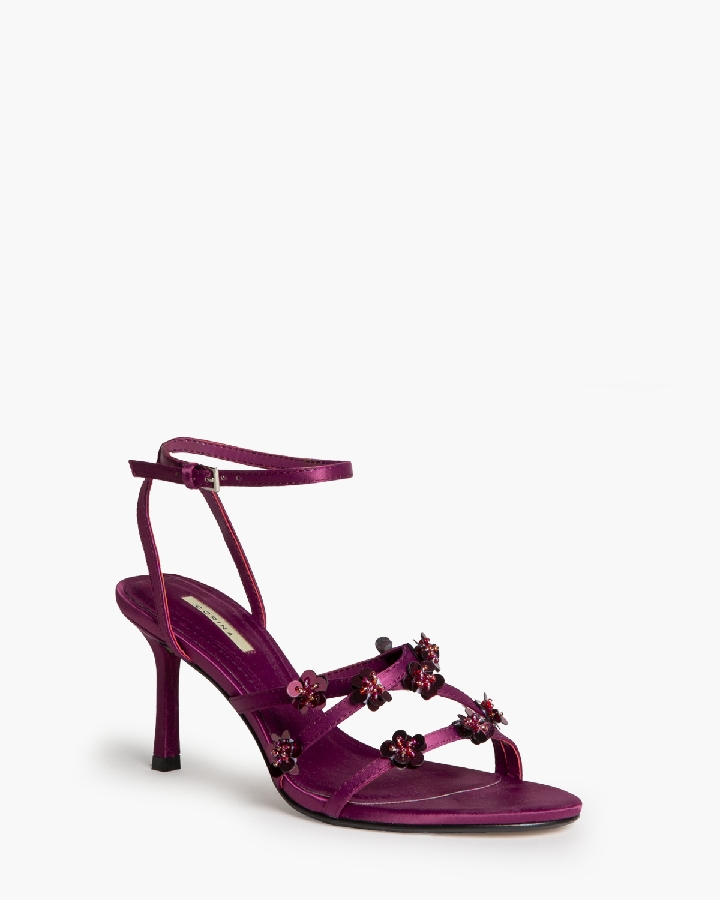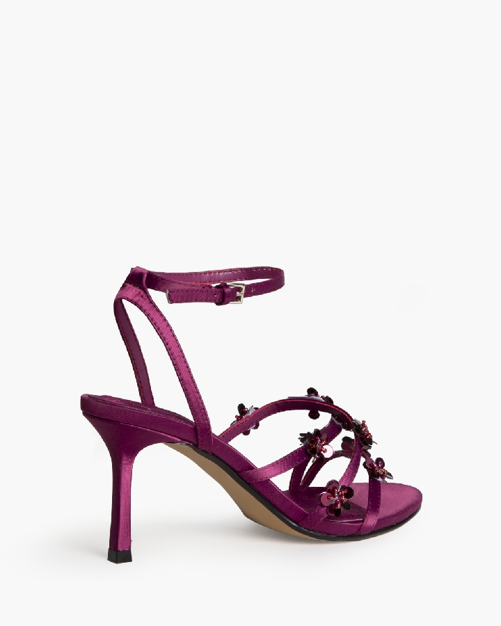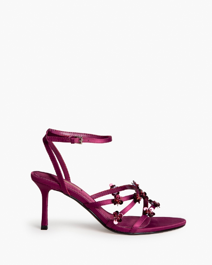 Sandalia de tacón alto. Adorno de flores en las tiras delanteras. Cierre mediante hebilla en la pulsera del tobillo. Acabado en punta redonda.