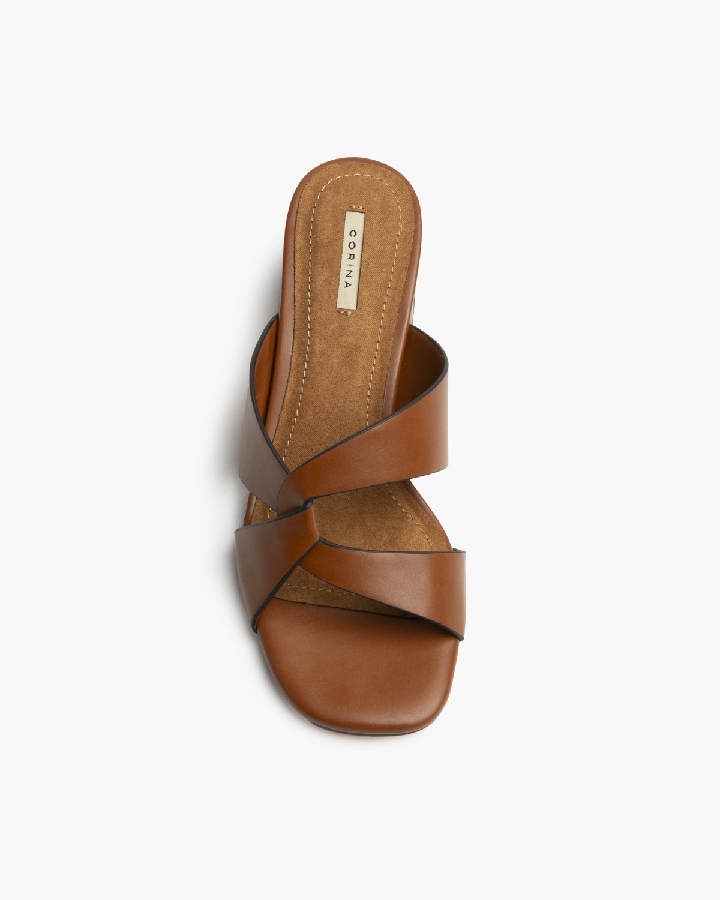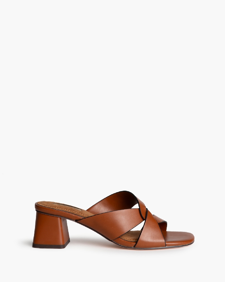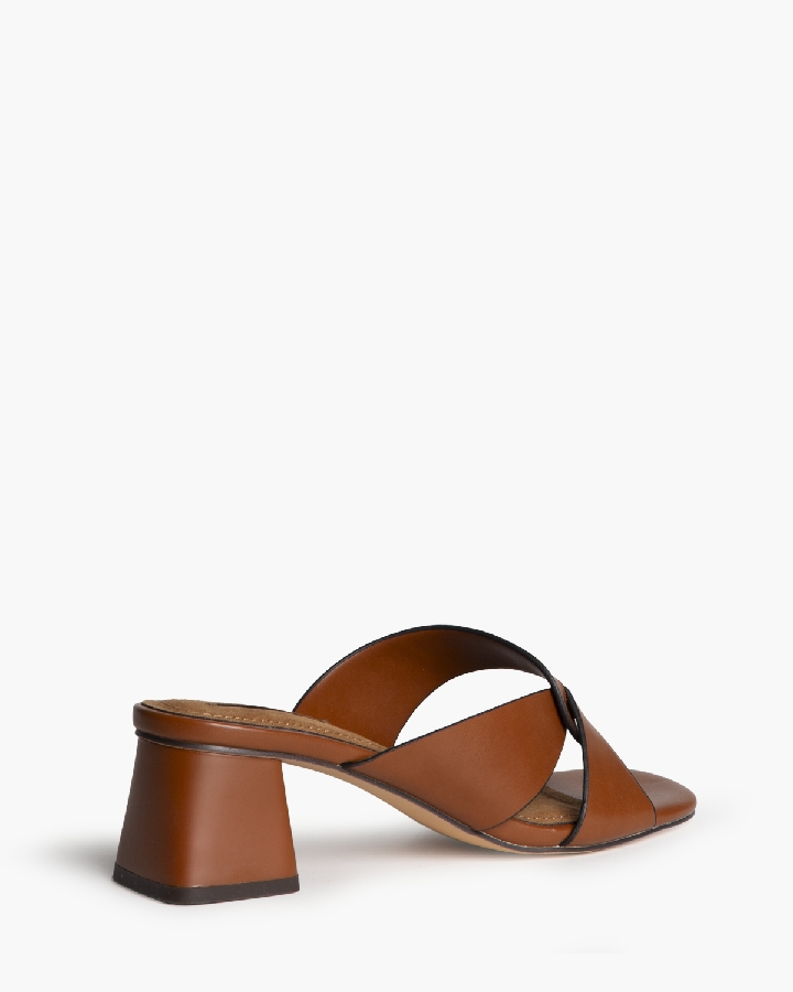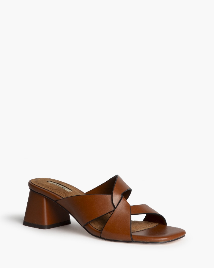 Sandalia de tacón bajo. Corte de pala con corte asimétrico. Tacón ancho y acabado en punta cuadrada.