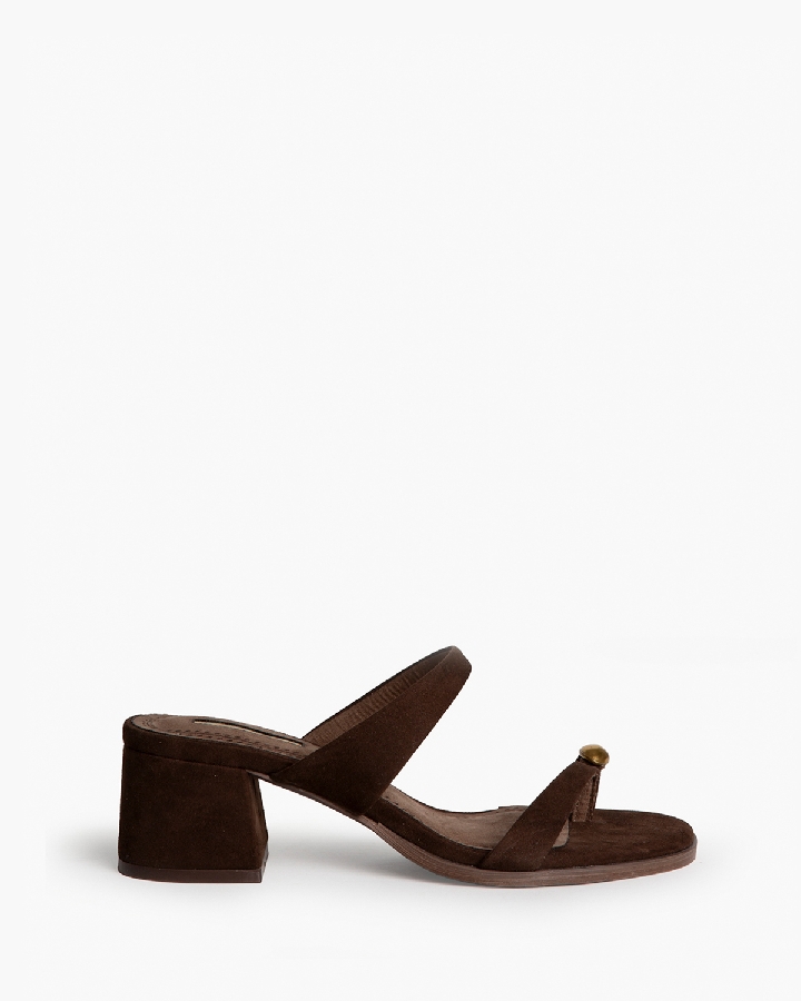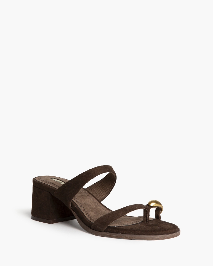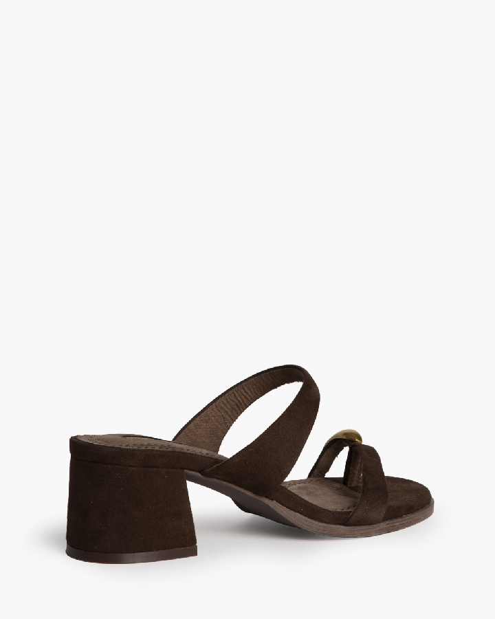 Sandalia de tacón bajo. Detalle de anillo en el dedo pulgar. Tacón ancho y acabado en punta redonda.