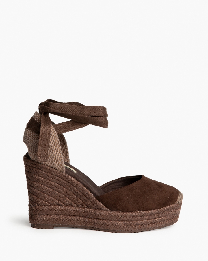 Plataforma tipo valenciana, con cuña en yute. Escote redondo. Cierre mediante tiras anudadas al tobillo.